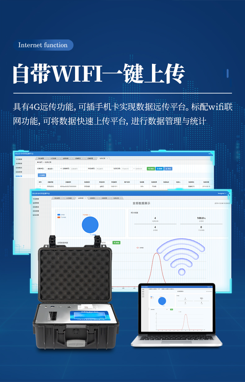 11、儀器具有4G遠(yuǎn)傳功能,可插手機(jī)卡實(shí)現(xiàn)數(shù)據(jù)遠(yuǎn)傳平臺。標(biāo)配wifi聯(lián)網(wǎng)功能,可將數(shù)據(jù)快速上傳平臺,進(jìn)行數(shù)據(jù)管理與統(tǒng)計。
