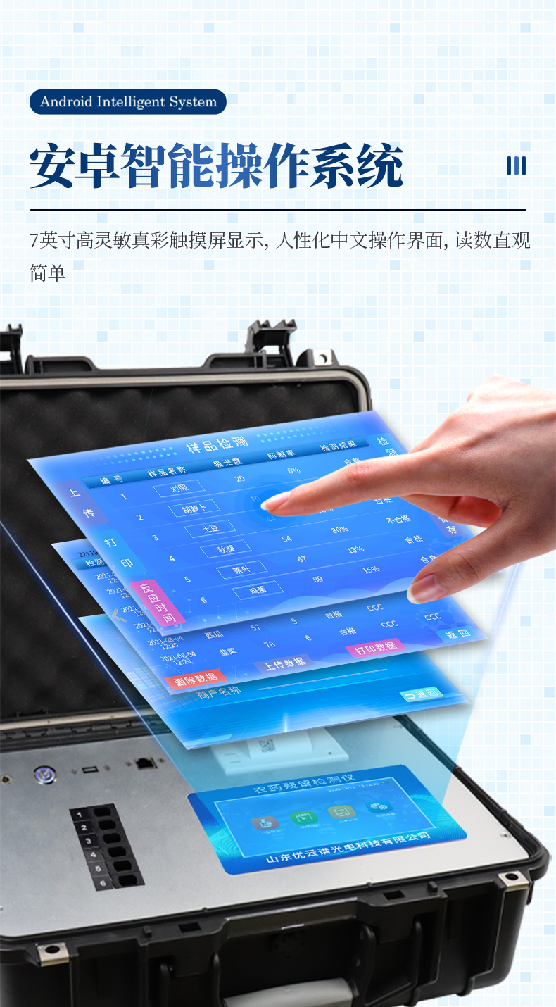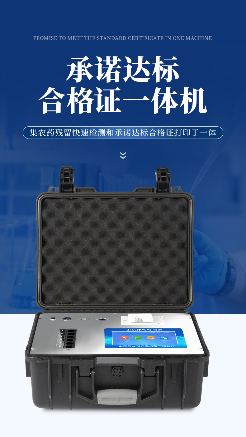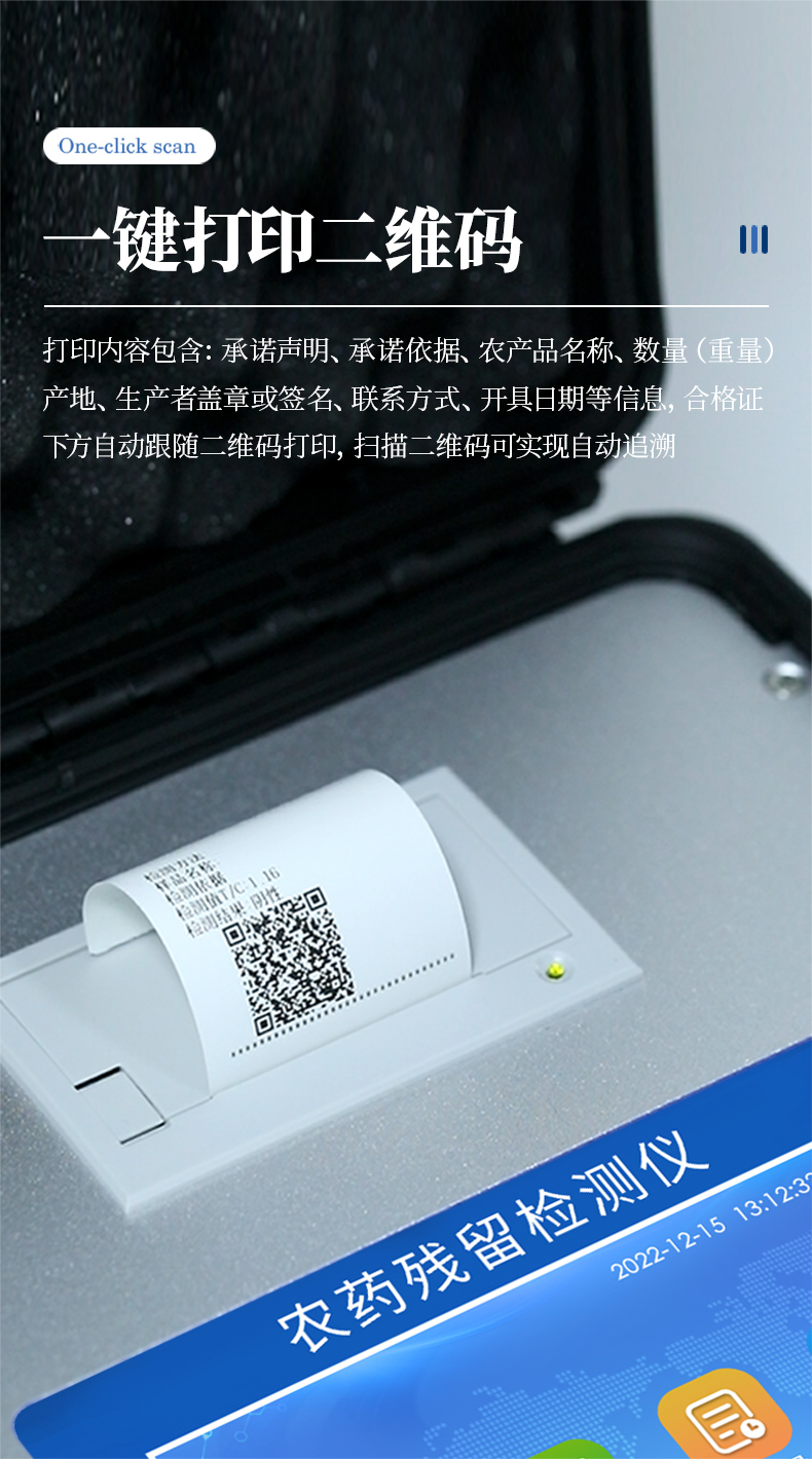 山東優(yōu)云譜光電科技有限公司是一家專業(yè)生產(chǎn)食品快檢儀器的高新技術(shù)領(lǐng)域企業(yè)。我公司根據(jù)農(nóng)村農(nóng)業(yè)部辦公廳關(guān)于《加快推進(jìn)承諾達(dá)標(biāo)合格證制度試行工作的通知》,在原有的食用農(nóng)產(chǎn)品合格證檢測打印一體機(jī)的基礎(chǔ)上優(yōu)化了打印標(biāo)簽,使打印標(biāo)頭和打印內(nèi)容符合承諾達(dá)標(biāo)合格證的最新要求。該儀器集農(nóng)藥殘留快速檢測和承諾達(dá)標(biāo)合格證打印于一體,智能化程度高,在快速檢測的同時實(shí)現(xiàn)承諾達(dá)標(biāo)合格證的打印。打印內(nèi)容包含:承諾聲明、承諾依據(jù)、農(nóng)產(chǎn)品名稱、數(shù)量(重量)、產(chǎn)地、生產(chǎn)者蓋章或簽名、聯(lián)系方式、開具日期等信息,合格證下方自動跟隨二維碼打印,掃描二維碼可實(shí)現(xiàn)自動追溯。實(shí)現(xiàn)農(nóng)產(chǎn)品安全的全程數(shù)據(jù)溯源,適合各地檢測機(jī)構(gòu)、農(nóng)業(yè)合作社、蔬菜批發(fā)市場等單位使用。