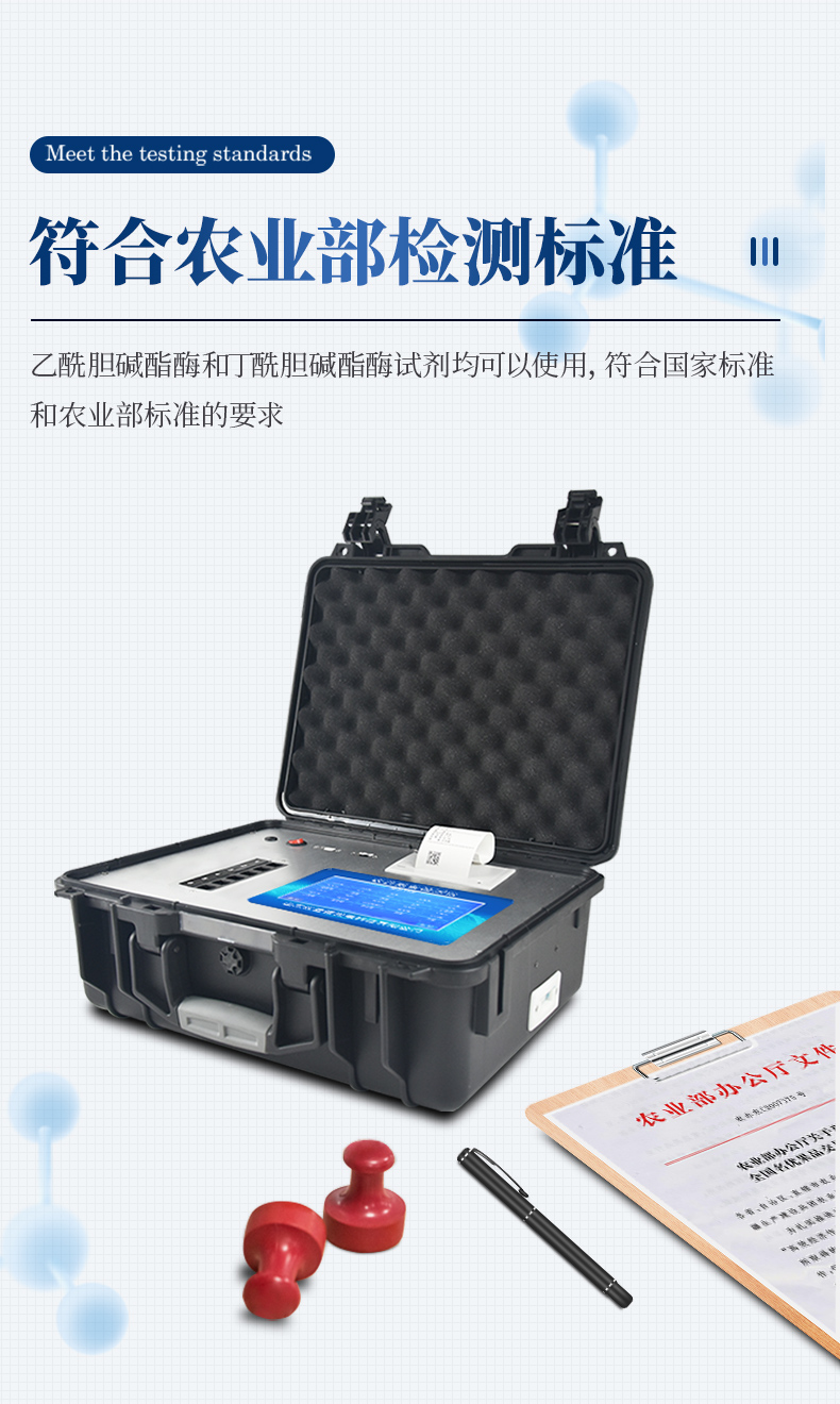 檢測標(biāo)準(zhǔn):依據(jù)國家標(biāo)準(zhǔn)方法(GB/T5009.199-2003)以及世界衛(wèi)生組織WHO、世界糧農(nóng)組織FAO殘留農(nóng)藥檢測標(biāo)準(zhǔn)、世界環(huán)境保護(hù)局EPA參照攝入量等要求來設(shè)計。采用酶抑制率比色法對水果、蔬菜等農(nóng)產(chǎn)品中有機(jī)磷和氨基甲酸酯類農(nóng)藥含量進(jìn)行快速準(zhǔn)確的檢測。
