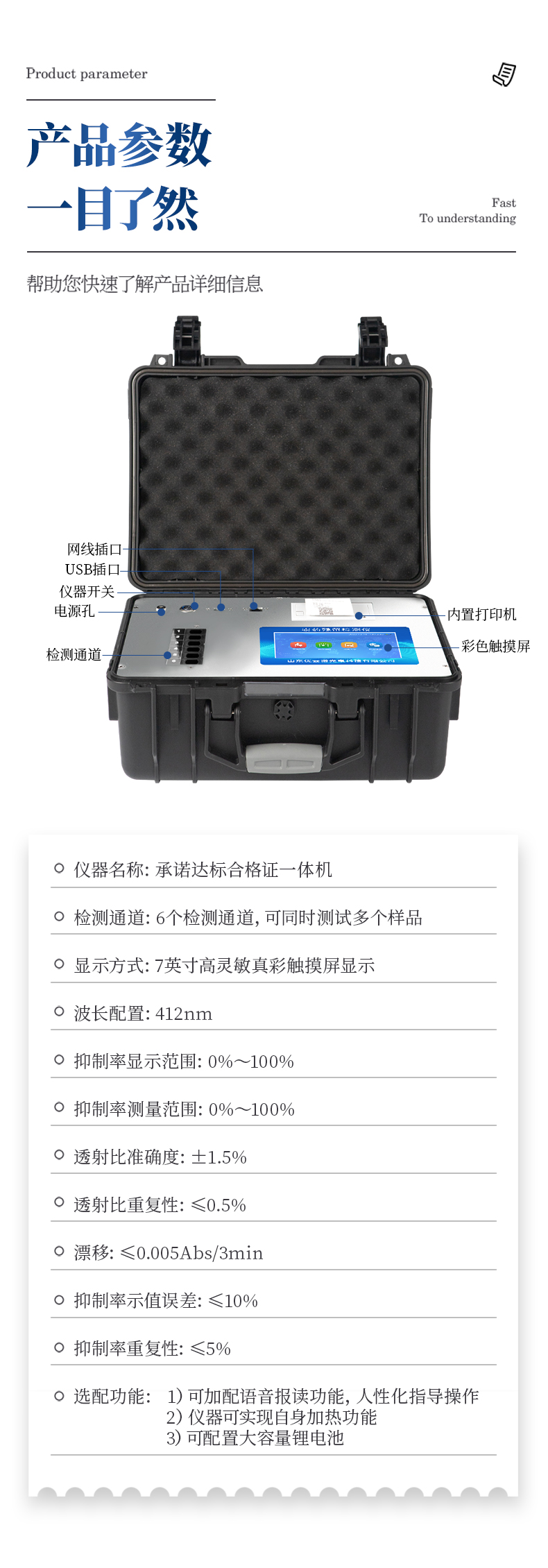 1、高強(qiáng)度PVC工程塑料手提箱設(shè)計,堅固耐用,便于攜帶,供電方式為交直流兩用,可野外流動測試配套成品藥劑。