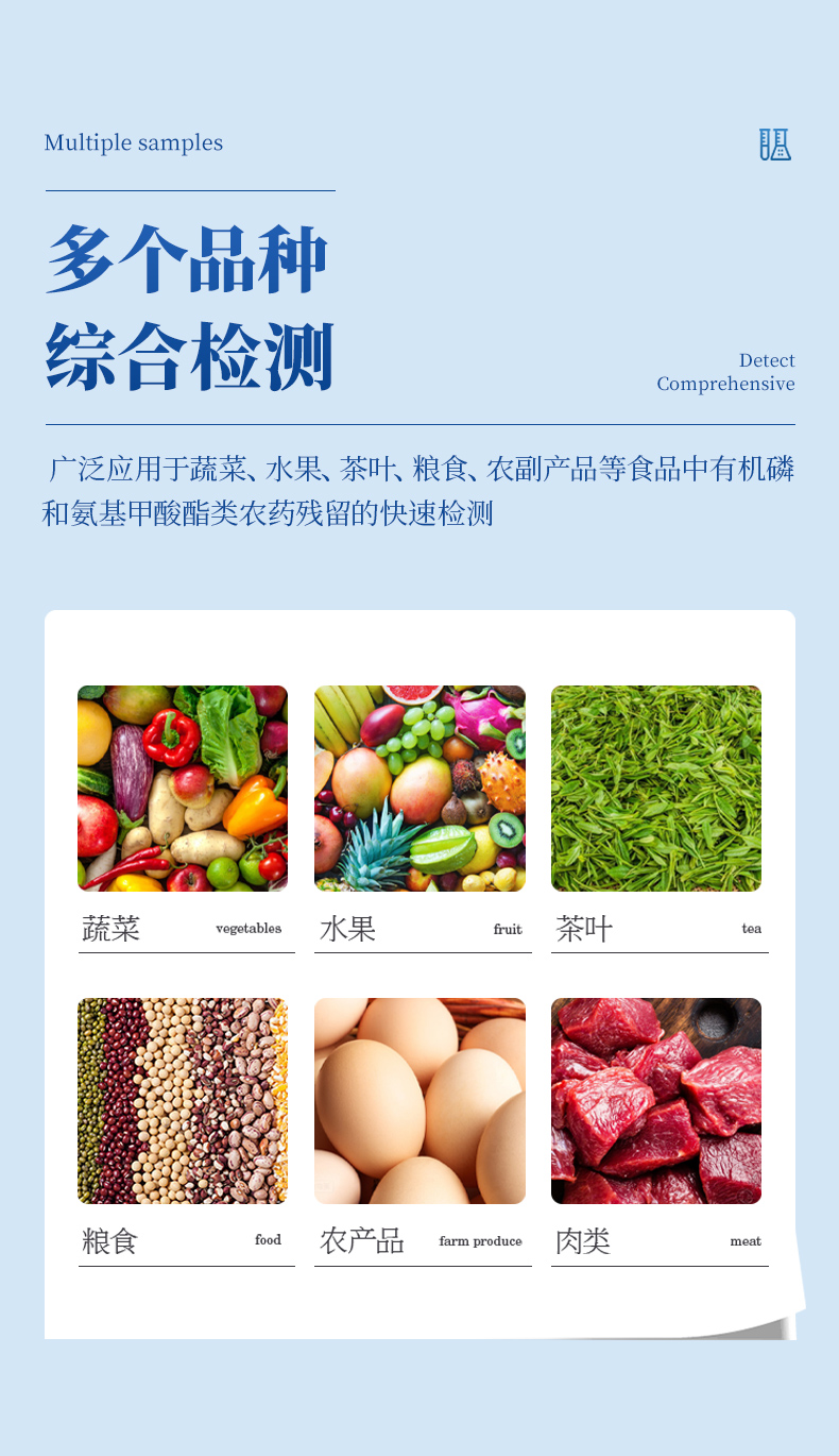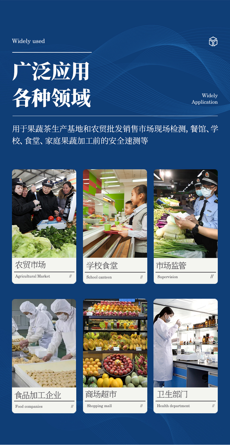 廣泛應(yīng)用于蔬菜、水果、茶葉、糧食、農(nóng)副產(chǎn)品等食品中有機(jī)磷和氨基甲酸酯類農(nóng)藥殘留的快速檢測;此外還可用于果蔬茶生產(chǎn)基地和農(nóng)貿(mào)批發(fā)銷售市場現(xiàn)場檢測,餐館、學(xué)校、食堂、家庭果蔬加工前的安全速測等。