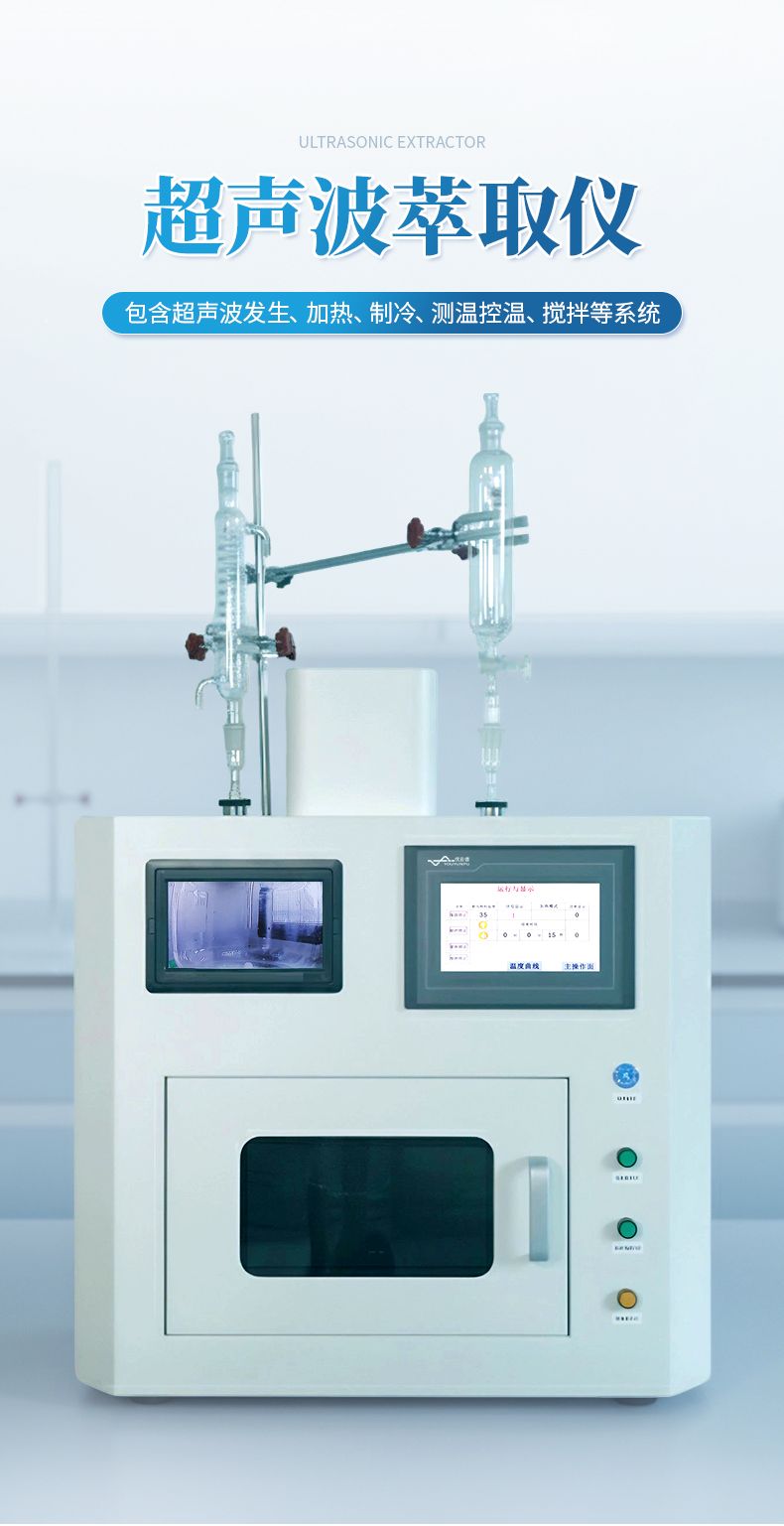 超聲波萃取儀使用超聲波技術然后結合運用低溫恒溫系統作為輔助,整套系統包含大功率超聲波 發(fā)生系統、加熱系統、壓縮機制冷系統、測溫控溫系統、攪拌系統等,在能控制反應體系溫度的 條件下,能有效促進反應物的高效率混合及促進催化化學反應。