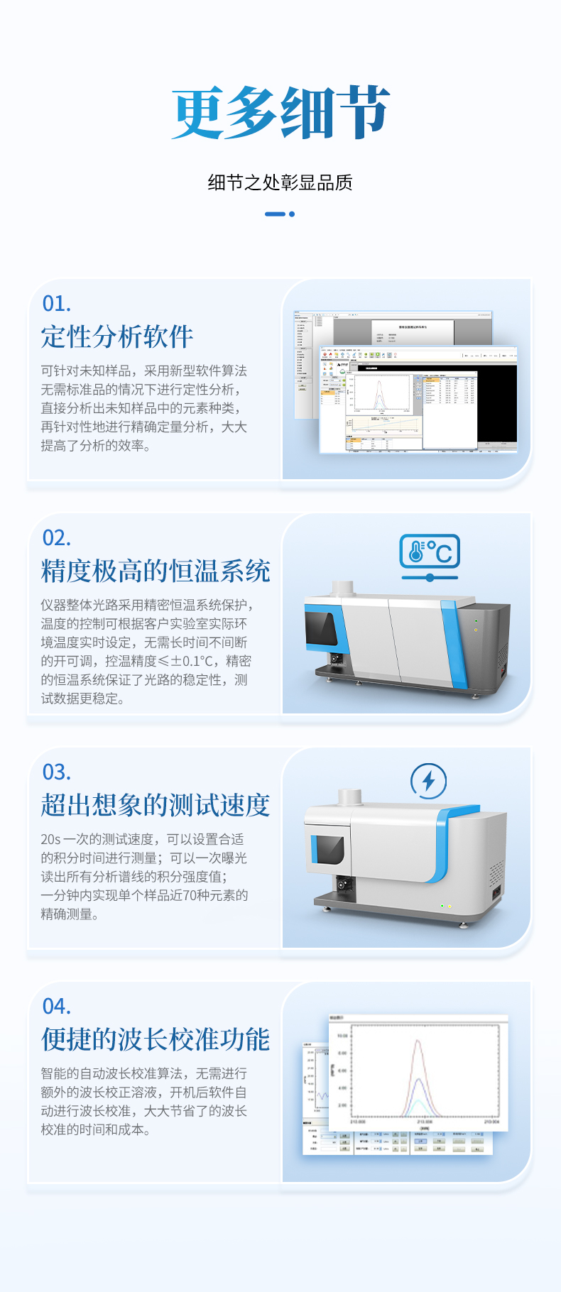7、超高分辨率的光路系統(tǒng): 儀器配置了超高分辨率的 4320 刻線的進(jìn)口光柵,配合獨(dú)有的光路調(diào)節(jié)專利 技術(shù),把普通儀器的分辨率約 0.008nm 降低至 0.005nm 以內(nèi),超高的分辨率保證 了測試元素之間沒有相互干擾。