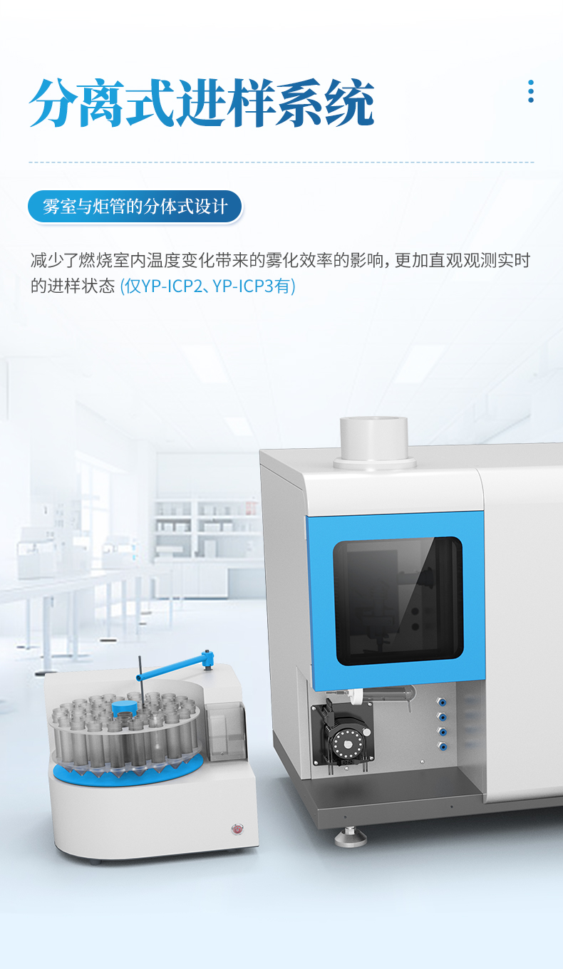 霧室與炬管的分體式設(shè)計(jì),較少了燃燒室內(nèi)溫度變化帶來(lái)的霧化效率的影響,更加直觀的觀測(cè)實(shí)時(shí)的進(jìn)樣狀態(tài)。配合專利技術(shù)的加長(zhǎng)型霧室,有效進(jìn)行氣液分離,較少水蒸氣的干擾。
