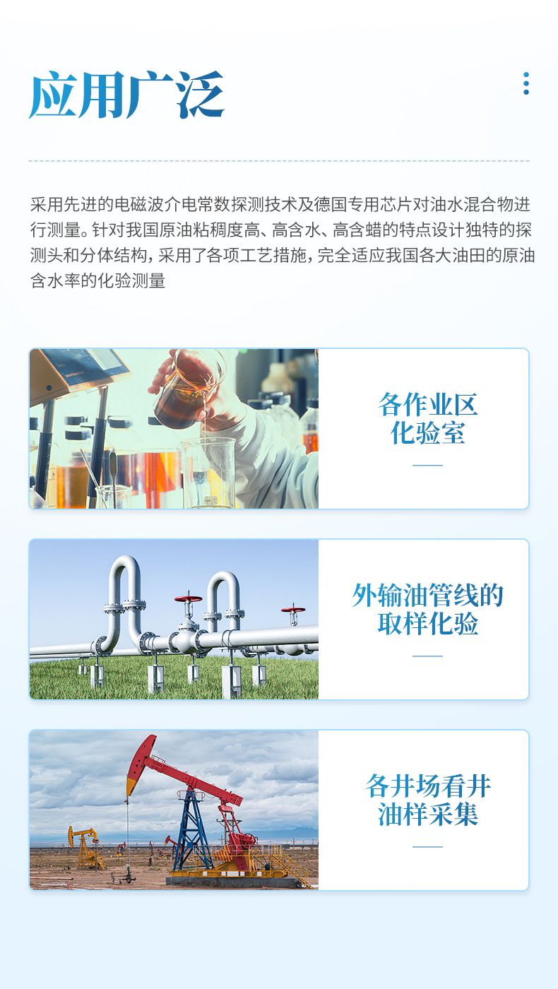 快速原油含水測定儀可用于各作業區化驗室對井口取樣的批量含水率的化驗分析。作業區化驗室擔負著整個作業區各個井口油樣和管線取樣液體的含水率的化驗工作,其工作量巨大,采用便攜式快速原油含水測定儀測量一個油樣只需要 10 幾秒種,大大提高了工作效率,原來一天需要幾個化驗員的工作量,現在一個人幾個小時就可以完成,大大的降低化驗員的勞動強度,提高效率,降低了企業用工成本。