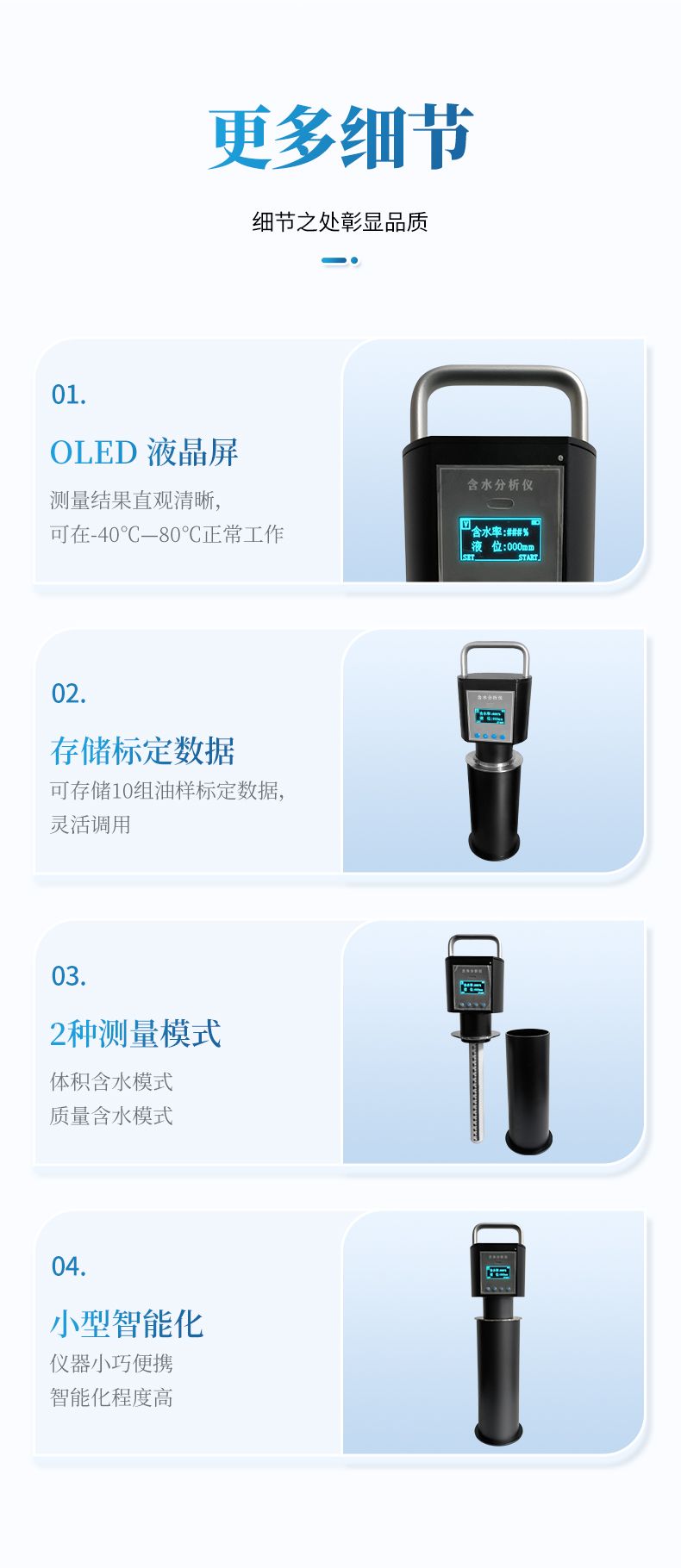 4、使用過程中省去了較耽擱時間的冷凍去明水,均勻攪拌、蒸餾、人工計算等流程。將測量探頭插入取樣量杯(量杯可以直接用取樣筒代替)中就可以迅速給出測量出結果。