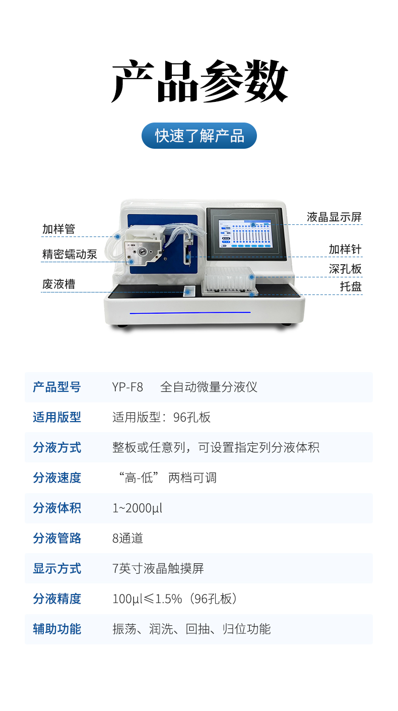 2、分液精度高,可達到96孔板100μl誤差1.5%以內,最小分液體積低至5μL,96孔板100μL加液時間12s。