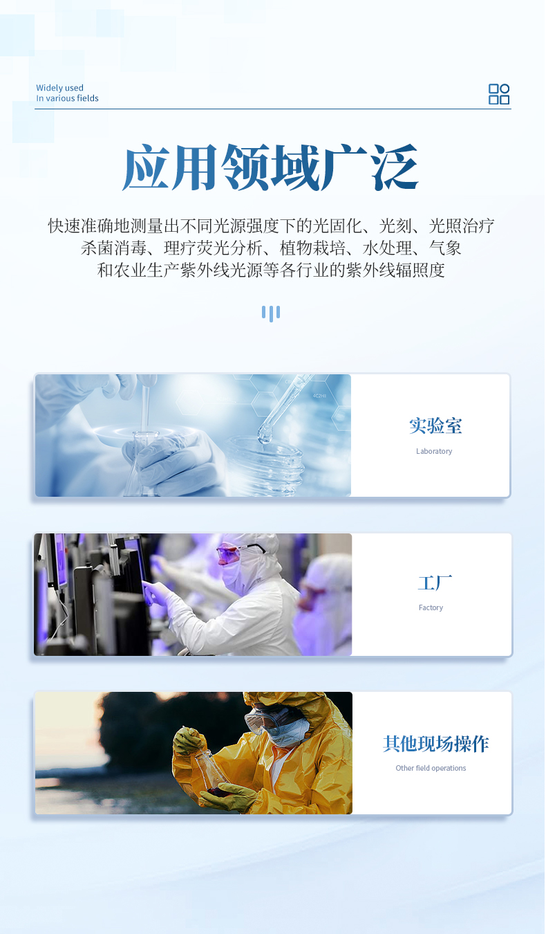 取,精度更高;量程可自動識別切換,真正實現從弱光到強光一機式測試,儀器操作更加簡單快捷。快速、準確地測量出不同光源強度下的光固化、光刻、光照治療、殺菌消毒、理療熒光分析、植物栽培、水處理、氣象和農業生產紫外線光源等各行業的紫外線輻照度。