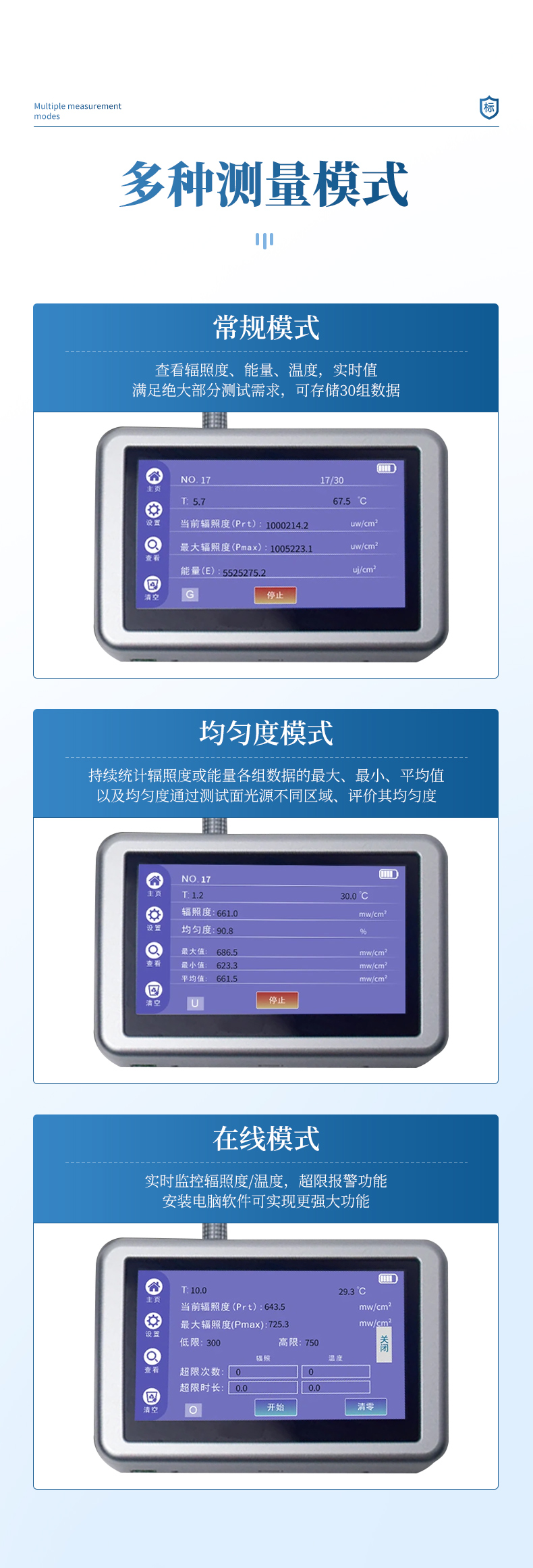 讀取,精度更高;測量模式可切換,可實時監控;可通過測試面光源不同區域、評價其均勻度;量程可自動識別切換,真正實現從弱光到強光一機式測試,儀器操作更加簡單快捷。快速、準確地測量出不同光源強度下的光固化、光刻、光照治療、殺菌消毒、理療熒光分析、植物栽培、水處理、氣象和農業生產紫外線光源等各行業的紫外線輻照度。