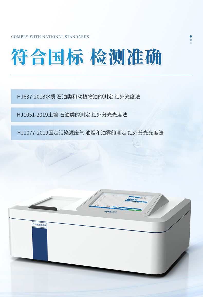 紅外分光測油儀是根據中國環境保護標準《HJ637-2018水質石油類和動植物油的測定 紅外分光光度法》、《HJ1051-2019土壤石油類的測定 紅外分光光度法》、《HJ1077-2019固定污染源廢氣 油煙和油霧的測定 紅外分光光度法》進行研發制造,該儀器主要檢測地表水、地下水、工業廢水、土壤、固定污染源廢氣、油煙和油霧中含油量測定的專用紅外光譜分析儀器。