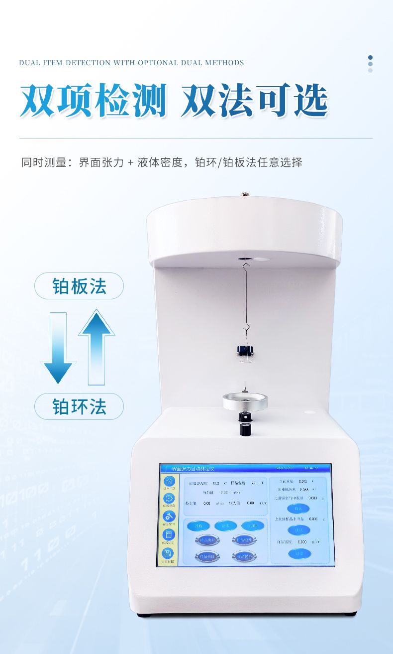 本儀器核心采用鉑環法與鉑板法兩種經典測量原理,基于表面張力的力學測量方式,通過高精度傳感器捕捉鉑環或鉑板與樣品液面接觸時的張力信號,經系統精準計算轉化為表面/界面張力數值;液體密度測量采用高精度密度傳感技術,結合恒溫控制模塊,確保密度測量的準確性;恒溫裝置通過閉環控溫系統,穩定維持樣品測試所需溫度,為各項指標檢測提供穩定環境,保障測量數據的可靠性與重復性。