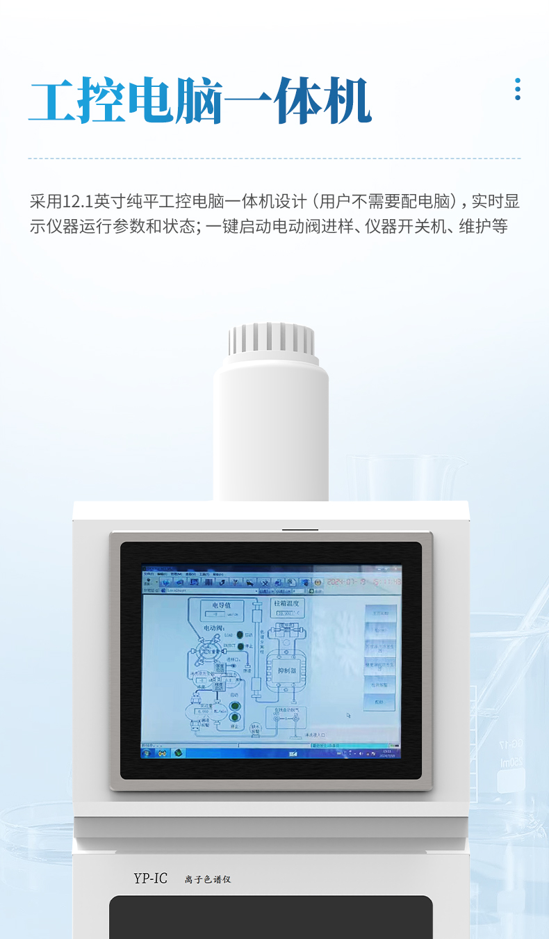 全新一代YP-IC-離子色譜儀,采用12.1吋純平工控電腦一體機設計(用戶不需要配電腦),實時顯示儀器運行參數和狀態;一鍵啟動電動閥進樣,一鍵完成儀器開關機、維護等操作,一鍵調閱儀器操作教程,方便快捷。