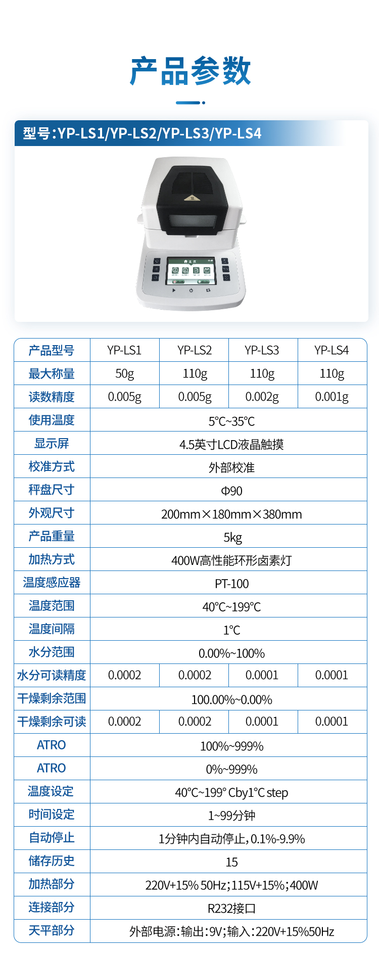 該系列快速水分測定儀應用了國際烘箱干燥法原理,測定結果與烘箱法水分測定具有良好的一致性,工作效率卻遠遠高于烘箱法水分測定,一般樣品只需要幾分鐘即可測量完畢,因此受到廣大用戶的青睞與好評。