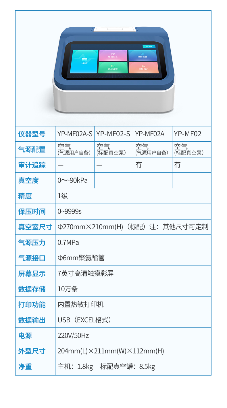2.自動恒壓補氣,進一步確保測試能夠在預設的真空條件下進行,抽壓、保壓、補壓、計時、反吹、存儲、打印全自動化一鍵操作;