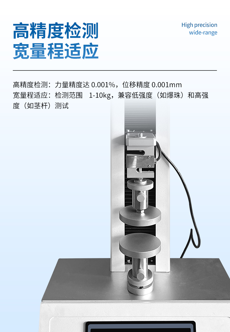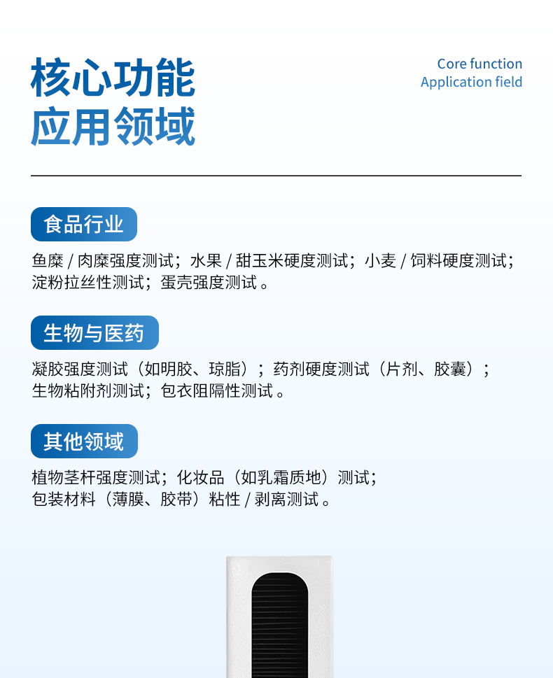廣泛應用于食品、生物制品、藥品、化妝品及包裝材料等諸多領域:可進行魚糜強度測試、蛋殼強度測試、肉品嫩度測試、肉品系水性測試、凝膠強度測試、香精爆珠測試、水果硬度測試、植物莖桿強度測試。小麥硬度測試、飼料硬度測試、茶葉桿預嫩度測試、甜玉米硬度測試。土硬度測試。淀粉拉絲性測試、劑破裂強度測試,劑包衣阻隔特性測試、錦劑膜衣粘性測試、顆粒狀藥劑的易碎性測試。柱劑硬度測試、生物粘附劑測試等等(不同測試用不同夾具)