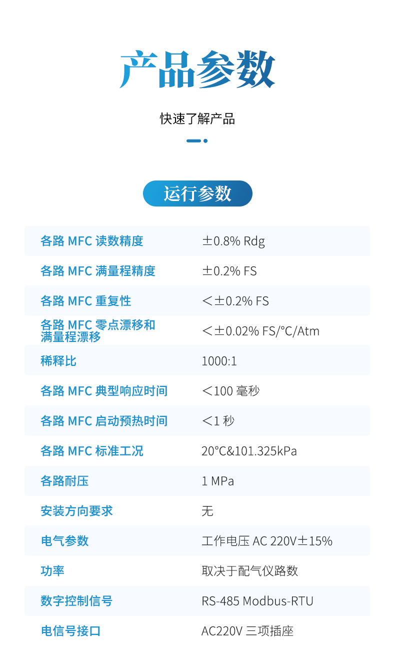 各路 MFC 零點漂移和滿量程漂移 <±0.02% FS/℃/Atm