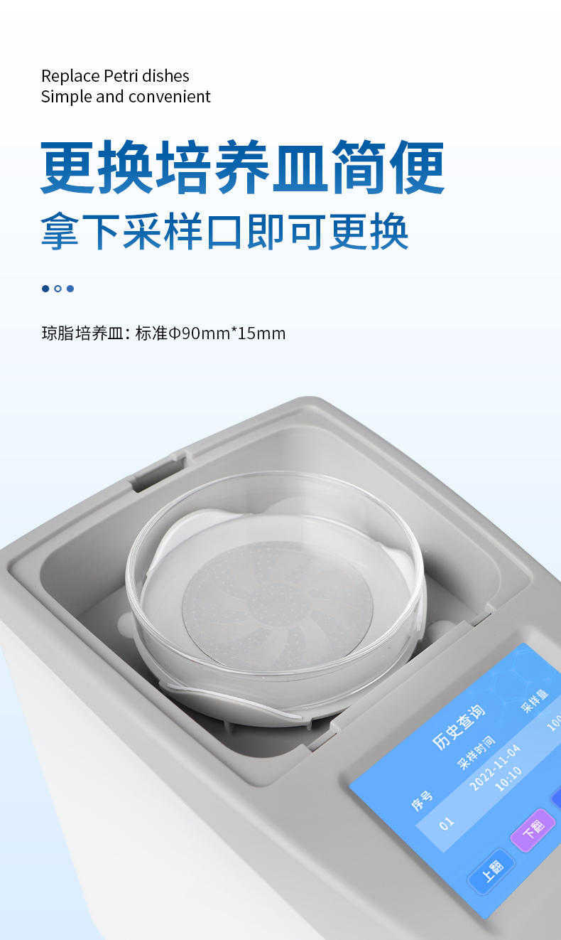 ● 更換培養皿簡便,拿下采樣口即可更換培養皿。