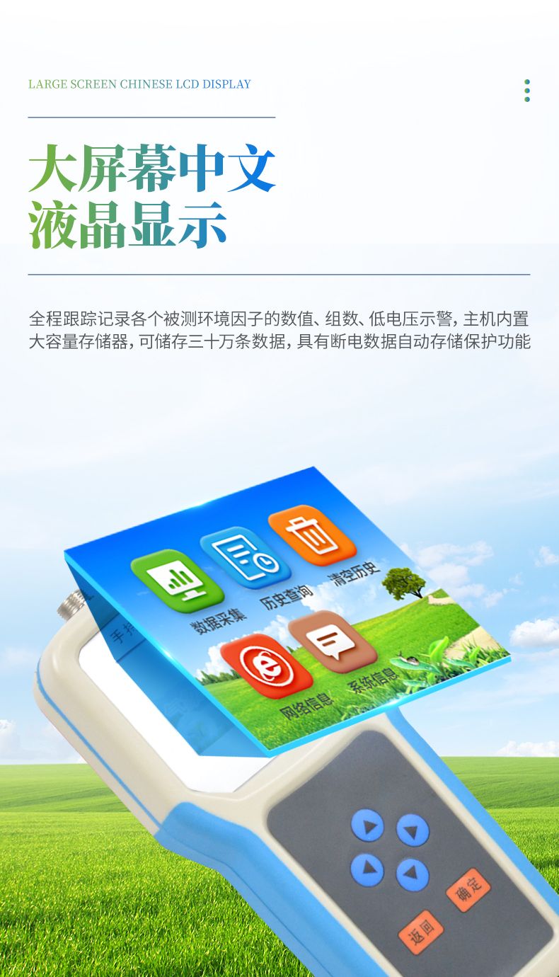 手持式智能農(nóng)業(yè)氣象環(huán)境檢測儀是我們專門針對農(nóng)田、草場局部小尺度環(huán)境設(shè)計的,對與植被和農(nóng)作物生長密切相關(guān)的土壤、水氣等環(huán)境參數(shù)監(jiān)測的農(nóng)田小氣候站。它主要觀測與農(nóng)業(yè)相關(guān)的空氣溫度、空氣濕度、光照強(qiáng)度、二氧化碳濃度、露點溫度、光合有效輻射、土壤溫度、土壤濕度、土壤鹽分、土壤PH等10個環(huán)境參數(shù)氣象要素,為農(nóng)業(yè)科研、農(nóng)業(yè)生產(chǎn)等提供良好的支持。