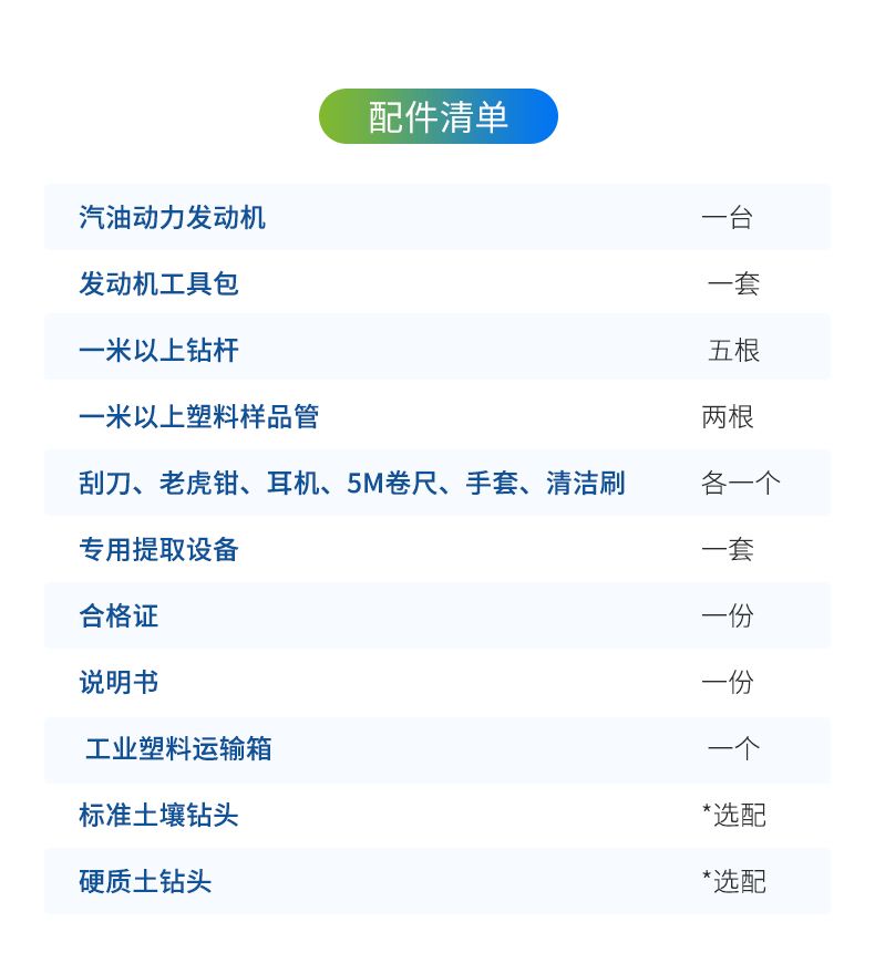 汽油動力發(fā)動機(jī)一臺,發(fā)動機(jī)工具包一套,標(biāo)準(zhǔn)土壤鉆頭、硬質(zhì)土鉆頭隨意選配,不小于1米的鉆桿5根、不小于1米的塑料樣品管2根,刮刀、老虎鉗、耳機(jī)、5M卷尺、手套、清潔刷各1個,專用提取設(shè)備1套、工業(yè)塑料運輸箱1個