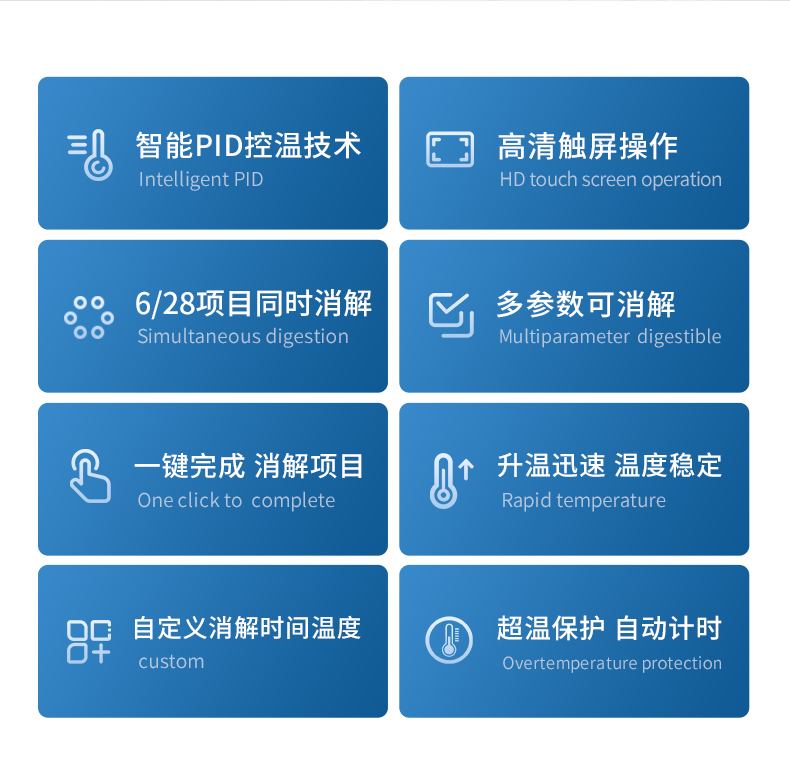 4、消解溫度與時間可根據所需檢測的樣品需求進行設定,具有預設溫度和保存功能;