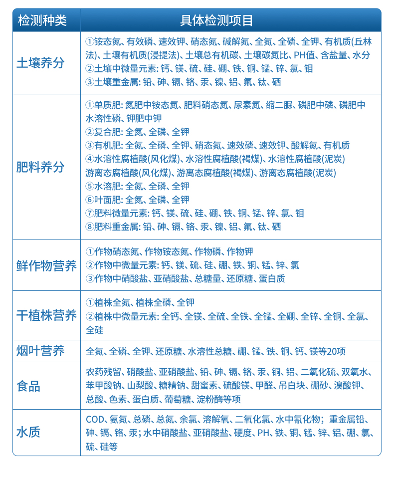 2、肥料養(yǎng)分:●單質(zhì)肥:氮肥中銨態(tài)氮、肥料硝態(tài)氮、尿素氮、縮二脲、磷肥中磷、磷肥中水溶性磷、鉀肥中鉀;●復(fù)合肥全氮、復(fù)合肥全磷、復(fù)合肥全鉀;●有機(jī)肥全氮、有機(jī)肥全磷、有機(jī)肥全鉀、有機(jī)肥硝態(tài)氮、有機(jī)肥速效磷、有機(jī)肥速效鉀、有機(jī)肥酸解氮、有機(jī)質(zhì);●水溶性腐植酸(風(fēng)化煤)、水溶性腐植酸(褐煤)、水溶性腐植酸(泥炭)、游離態(tài)腐植酸(風(fēng)化煤)、游離態(tài)腐植酸(褐煤)、游離態(tài)腐植酸(泥炭);●水溶肥全氮、水溶肥全磷、水溶肥全鉀;●葉面肥全氮、葉面肥全磷、葉面肥全鉀;●各種肥料微量元素:肥料鈣、肥料鎂、肥料硫、肥料硅、肥料硼、肥料鐵、肥料銅、肥料錳、肥料鋅、肥料氯、肥料鉬;●肥料重金屬:肥料鉛、肥料砷、肥料鎘、肥料鉻、肥料汞、肥料鎳、肥料鋁、肥料氟、肥料鈦、肥料硒。