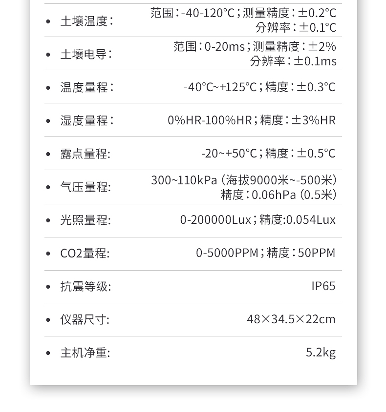 2、環(huán)境:土壤濕度、土壤溫度、土壤電導(dǎo)率、空氣溫度、空氣濕度、露點、大氣壓力、光照度、二氧化碳;