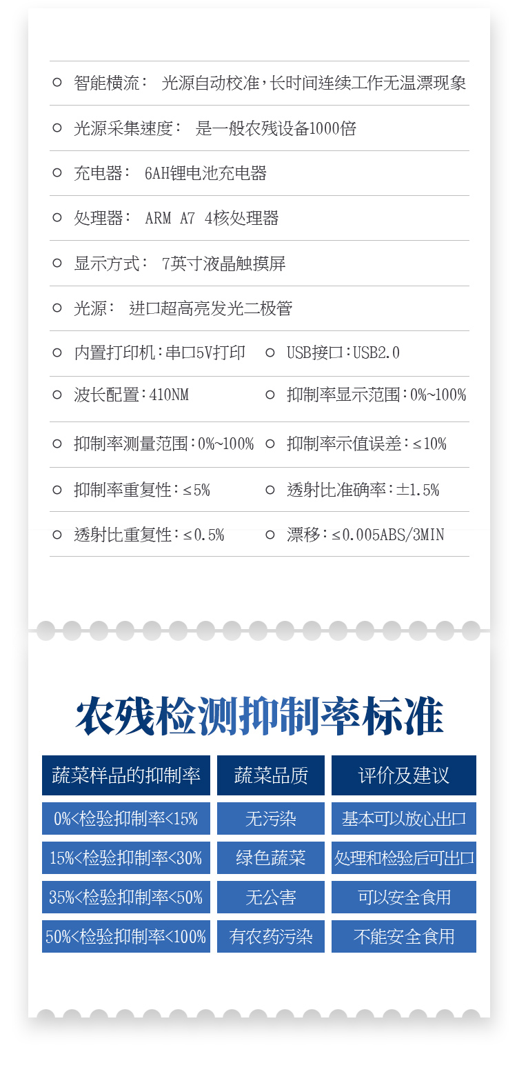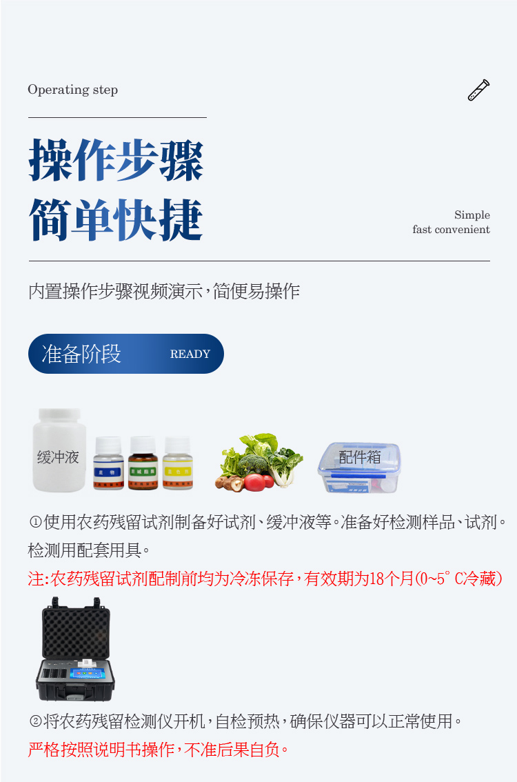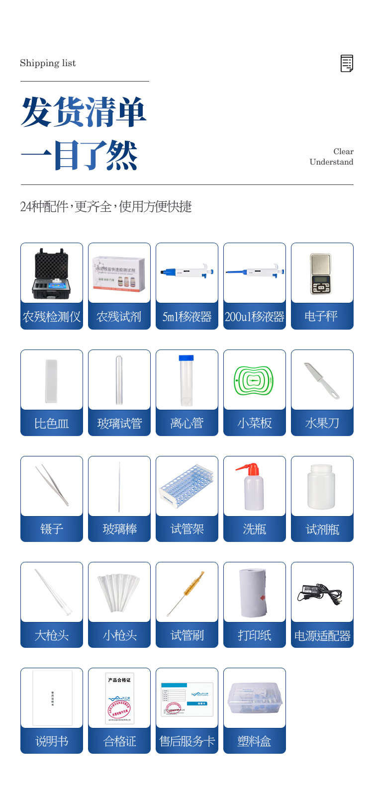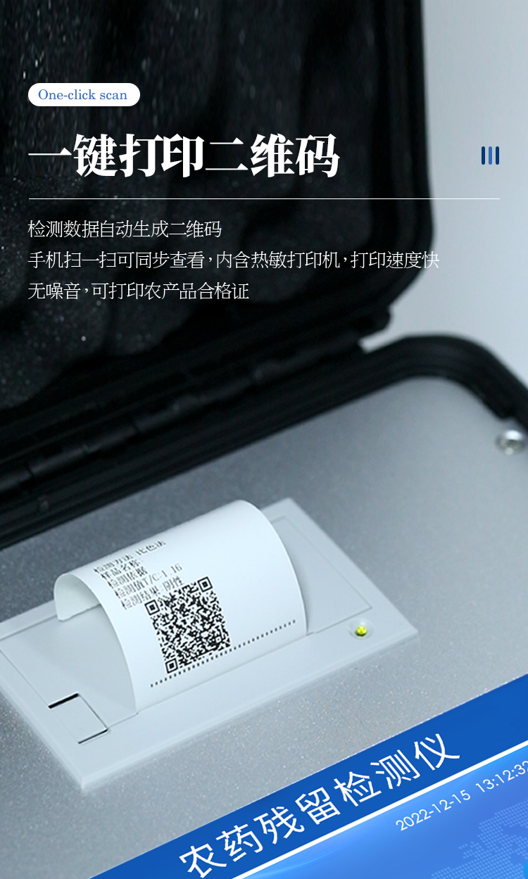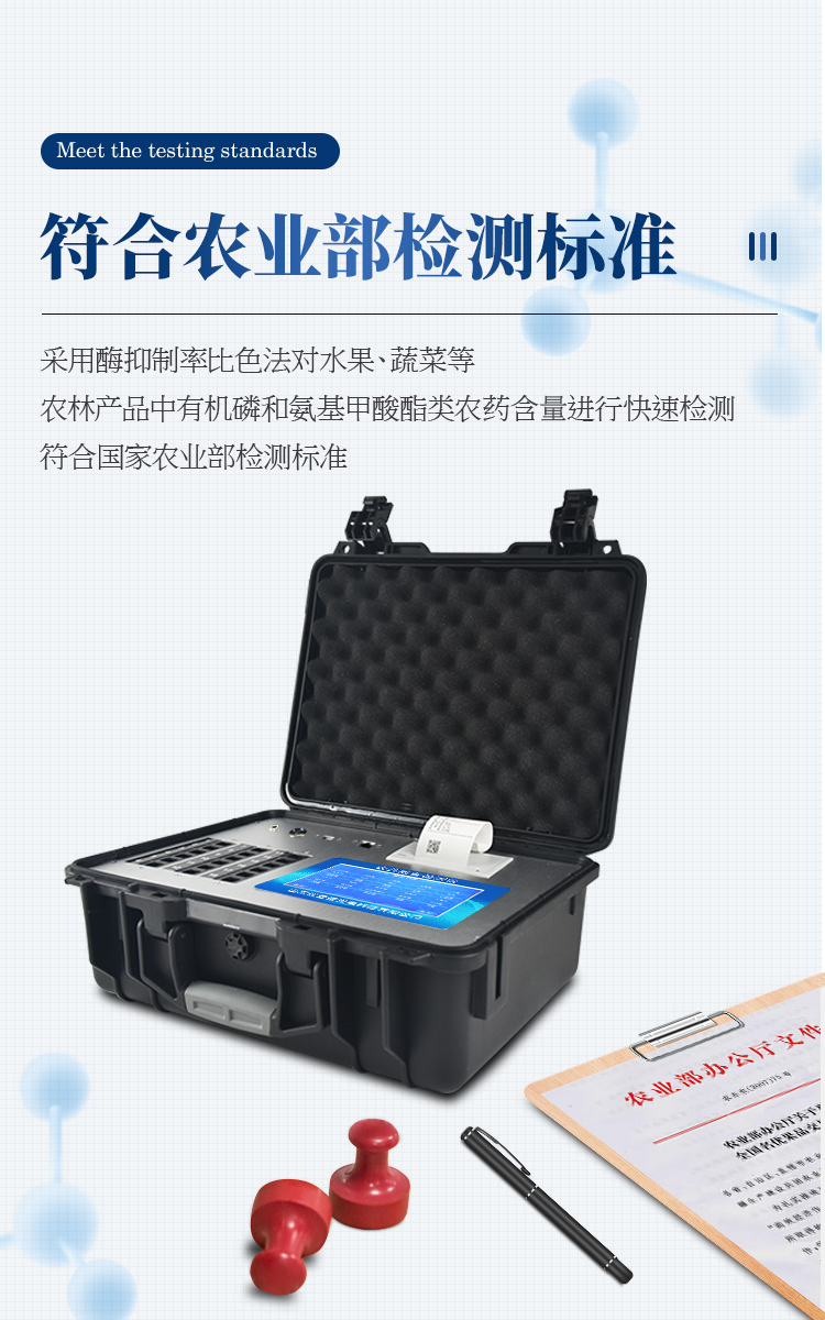 綜合農藥殘留檢測儀,除了遵循國標對有機磷和氨基甲酸酯類農藥進行檢測外,還可以針對具體農藥進行分項準確檢測,包含克百威、毒死蜱、異丙威、啶蟲脒、氟蟲腈、水胺硫磷、甲萘威、三唑磷、百草枯、甲霜靈、殺螟硫磷、百菌清-多菌靈2合1、氟蟲腈-甲萘威2合1、甲基對硫磷、乙草胺、吡蟲啉、多菌靈、阿維菌素、有機磷、甲草胺、涕滅威、百菌清、噻菌靈、三唑酮、氯吡脲、多效唑、氯噻啉、霜霉威、噻蟲啉、辛硫磷、4-氯苯氧乙酸、2,4-二氯苯氧乙酸、2,4,5-三氯苯氧乙酸、6-芐基腺嘌呤、除草定、烯啶蟲胺、噻蟲嗪、異菌脲、氟苯脲、腐霉利、甲氰菊酯、高效氯氟氰菊酯、二甲戊靈、氟節甲基異柳磷、噠螨靈、噻蟲胺、烯酰嗎啉、嘧菌酯、氟樂靈、嘧霉胺、三唑酮/三唑醇、滅蠅胺、戊唑醇、甲拌磷、氯蟲苯甲酰胺、二嗪磷、氧樂果、甲基吡啶磷、阿滅丁、雙甲脒等眾多殺蟲劑化合物。