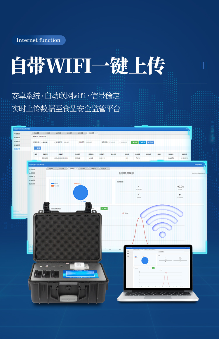 4、★儀器帶有監管平臺,數據可局域網和互聯網數據上傳,檢測結果直接傳至食品安全監管平臺。進行區域食品安全監管及大數據分析處理與數據統計,檢測區域食品安全長短期動態,達到食品安全問題預估、預警