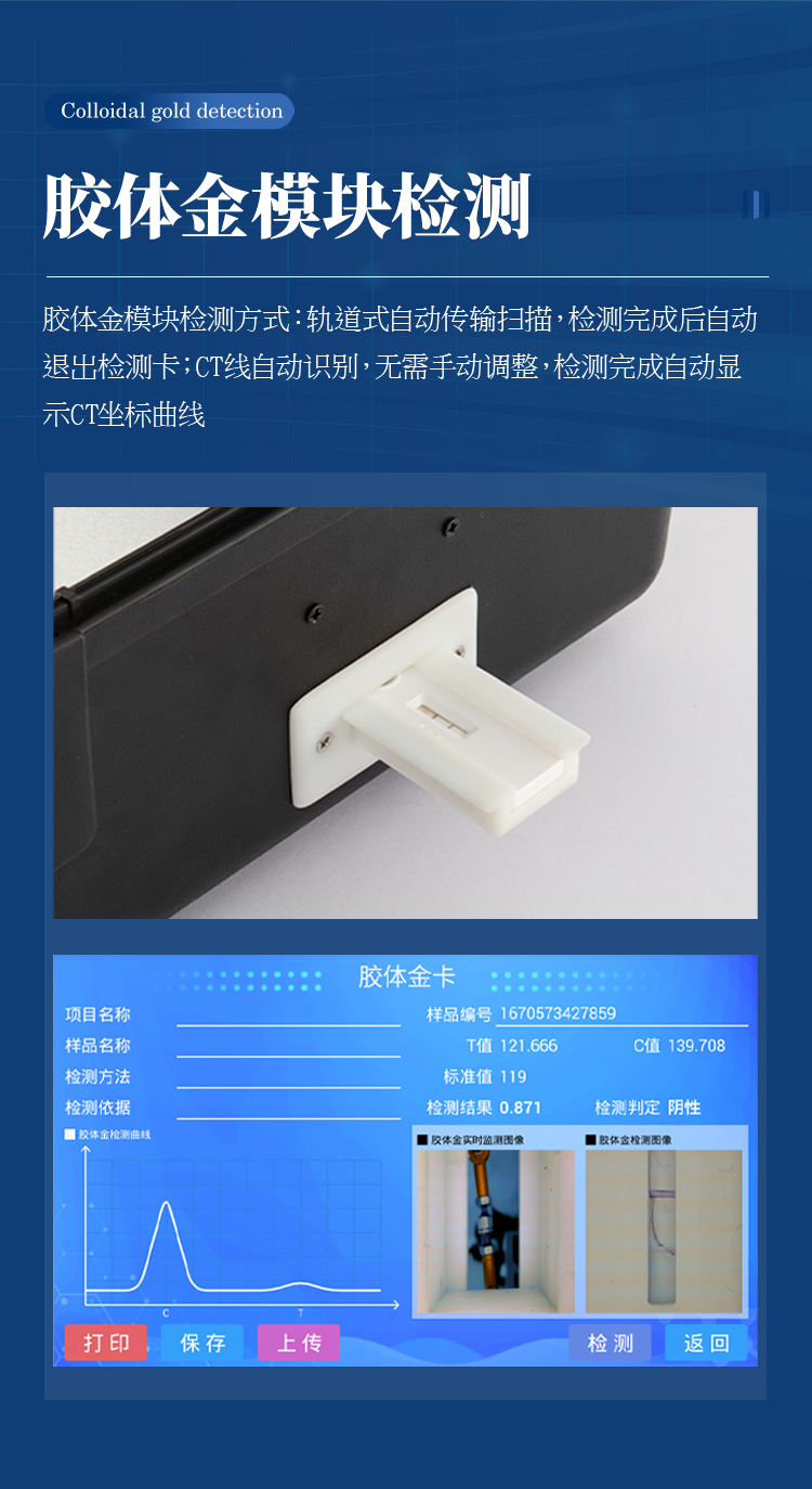 7、★雙膠體金模塊檢測方式:軌道式自動傳輸掃描,檢測完成后自動退出檢測卡。