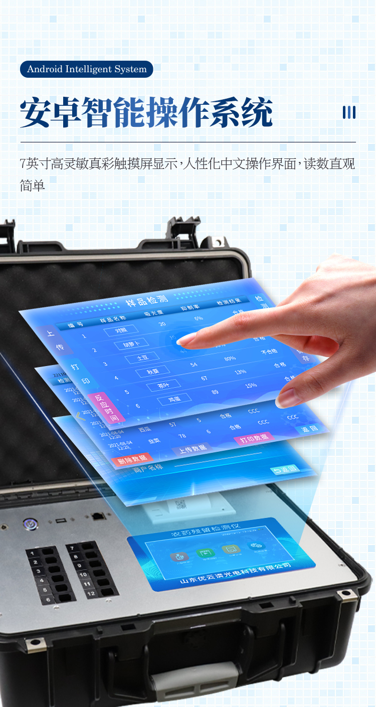 6、一體化便攜式快檢設備,滿足現場及流動檢測使用需求,能夠在同一軟件下實現所有檢測項目的檢測,并可通過同一窗口直觀顯示檢測結果。