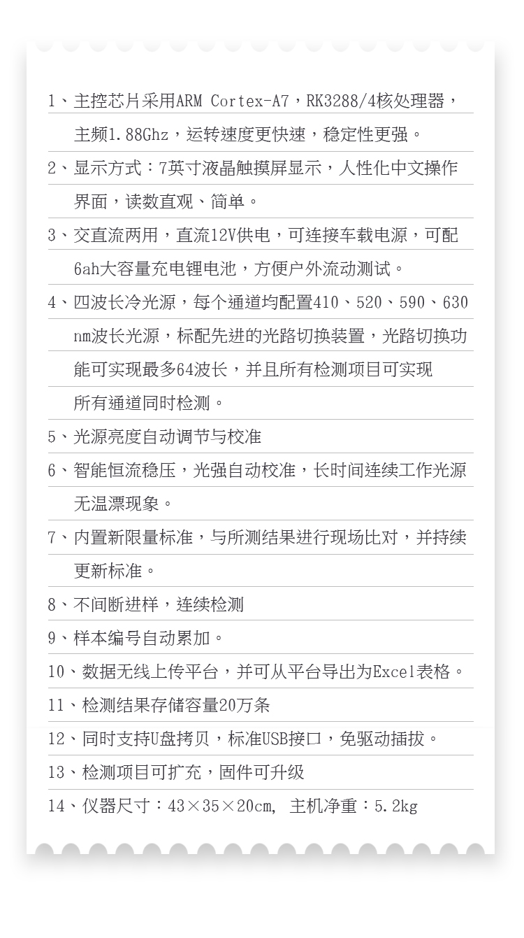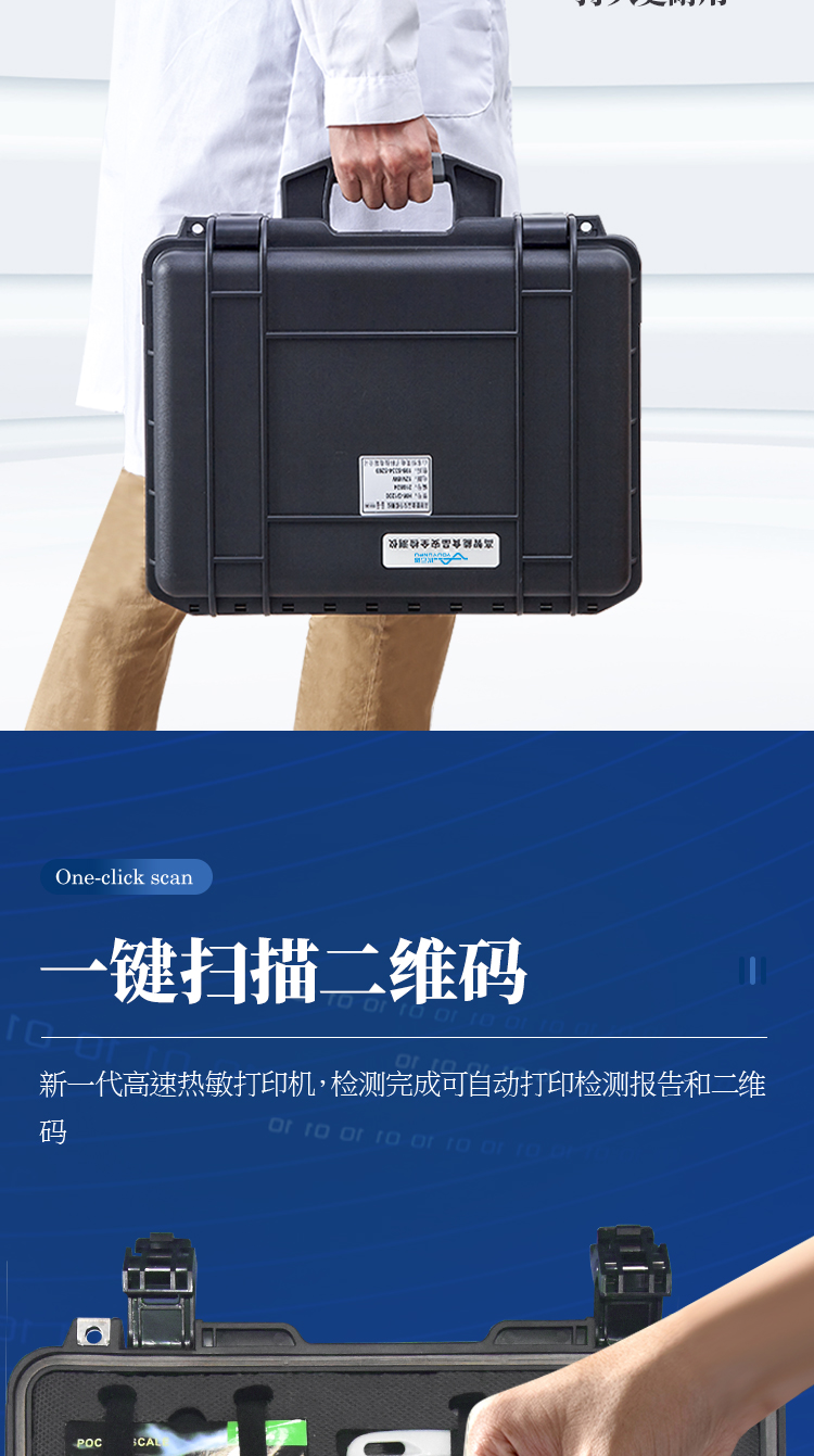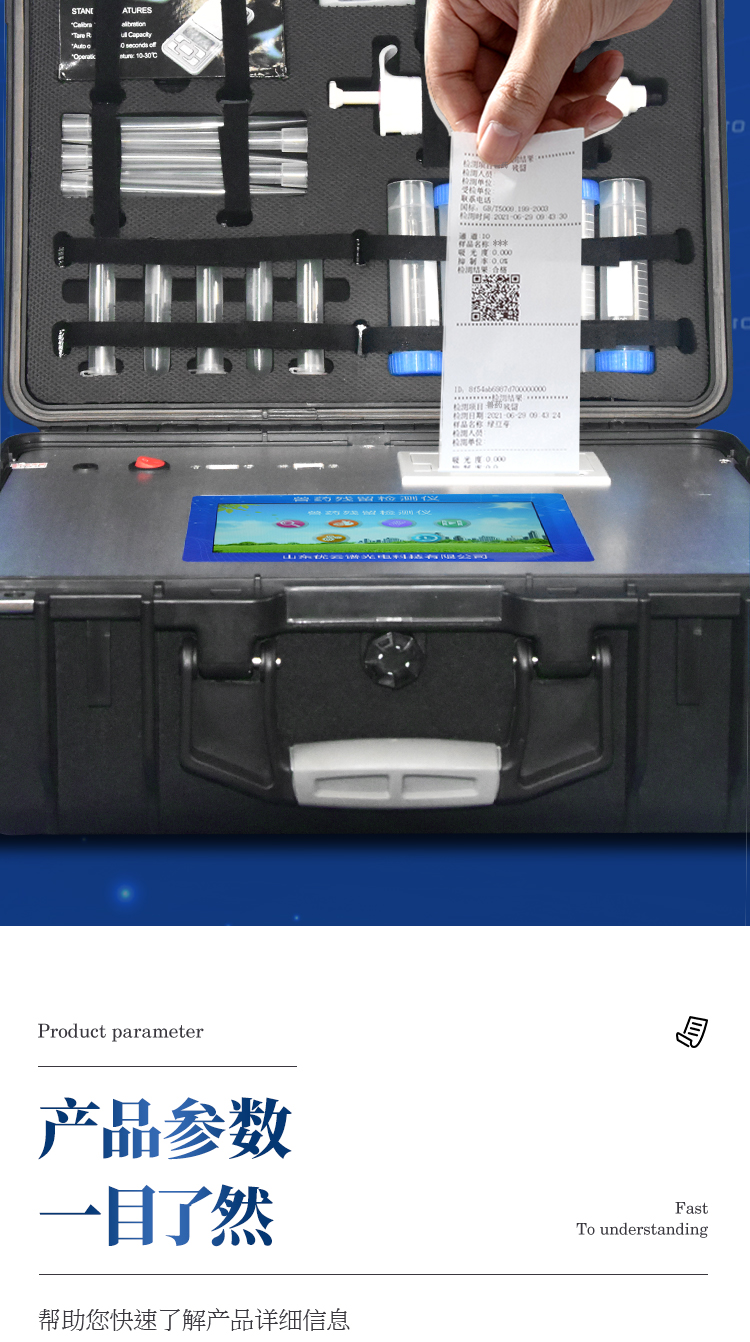 6、一體化便攜式快檢設(shè)備,滿足現(xiàn)場(chǎng)及流動(dòng)檢測(cè)使用需求,能夠在同一軟件下實(shí)現(xiàn)所有檢測(cè)項(xiàng)目的檢測(cè),并可通過(guò)同一窗口直觀顯示檢測(cè)結(jié)果。