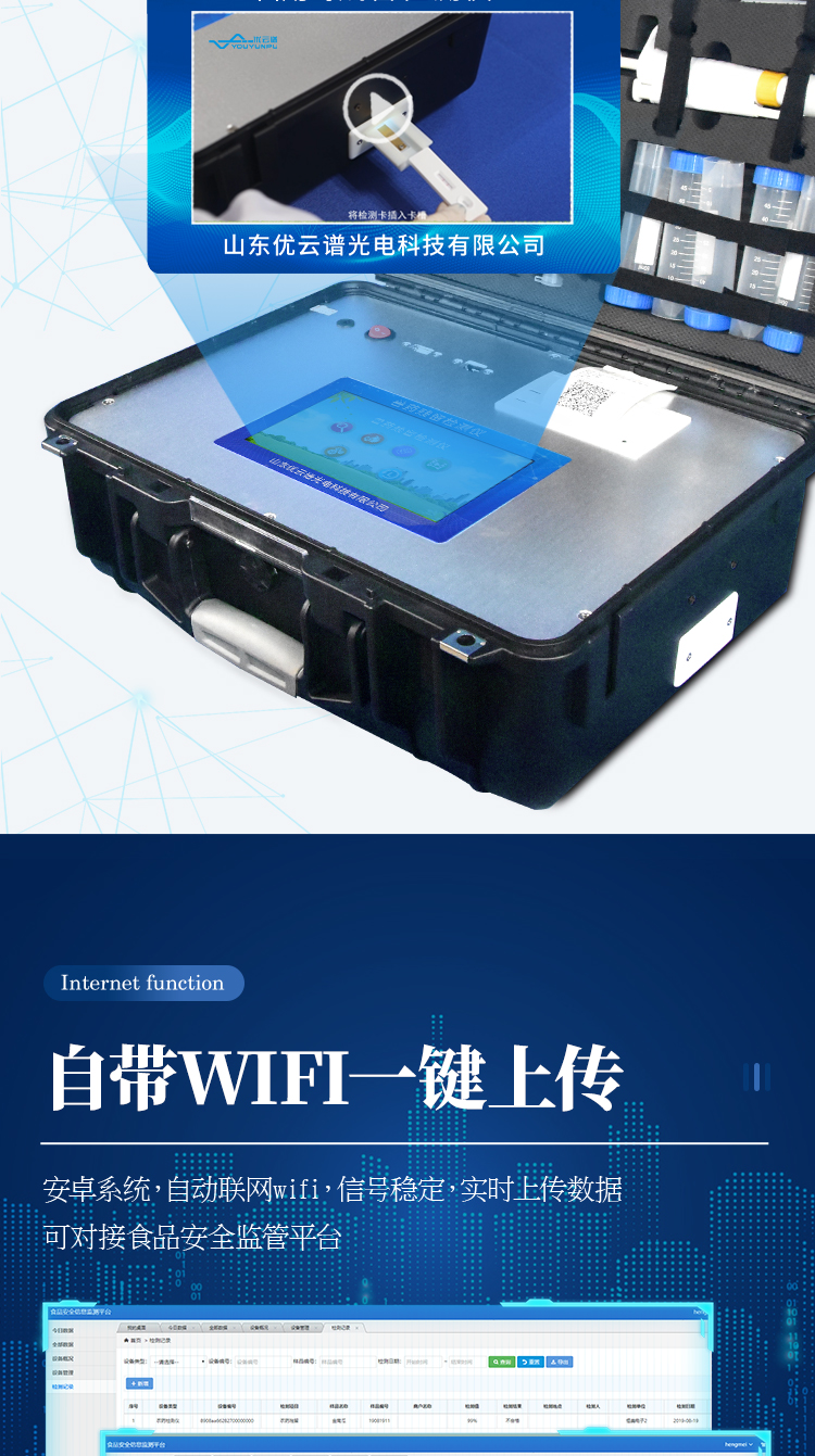 4、儀器帶有監(jiān)管平臺(tái)。數(shù)據(jù)可局域網(wǎng)和互聯(lián)網(wǎng)數(shù)據(jù)上傳,檢測(cè)結(jié)果直接傳至食品安全監(jiān)管平臺(tái)。進(jìn)行區(qū)域食品安全監(jiān)管及大數(shù)據(jù)分析處理與數(shù)據(jù)統(tǒng)計(jì),檢測(cè)區(qū)域食品安全長(zhǎng)短期動(dòng)態(tài),達(dá)到食品安全問(wèn)題預(yù)估、預(yù)警。