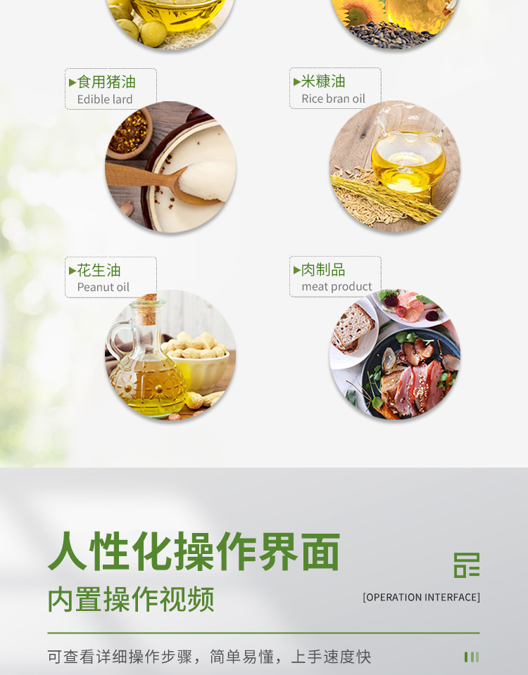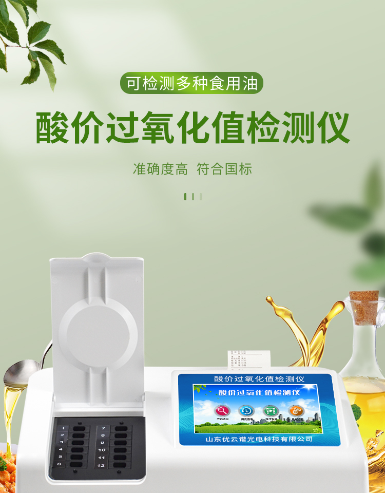 食用油酸價過氧化值檢測儀為集成化油品快速檢測分析設備,能夠快速檢測食用植物油、食用豬油、花生油、葵花油、米糠油、食品、肉制品中的酸價、過氧化值含量;通過檢測可確定植物油是否符合國家標準或是否為酸敗油、劣質油、地溝油等。儀器預留其他項目檢測程序和端口,根據日后需求可方便的自主增加檢測項目。日后可升級為檢測水產品、面制品的綜合類型儀器。