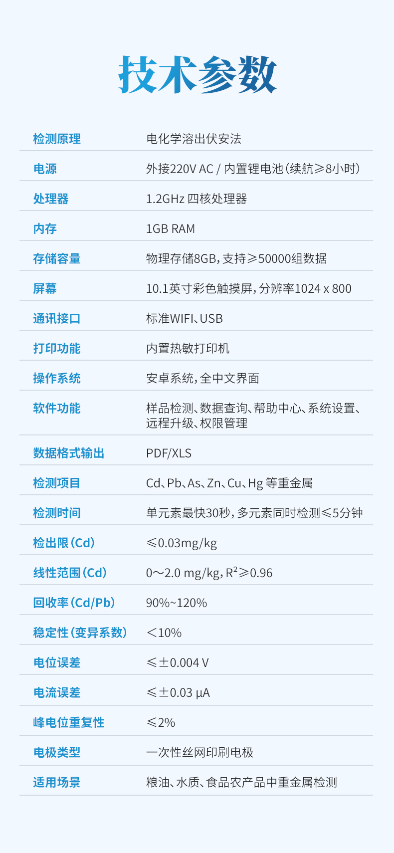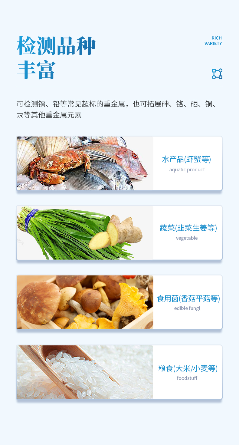 | 適用場景 | 糧油、水質(zhì)、食品農(nóng)產(chǎn)品中重金屬檢測 |