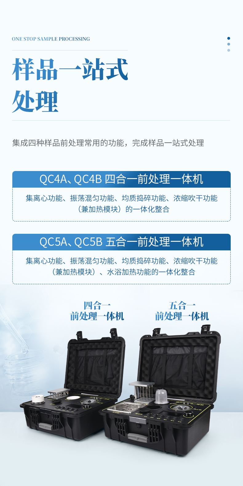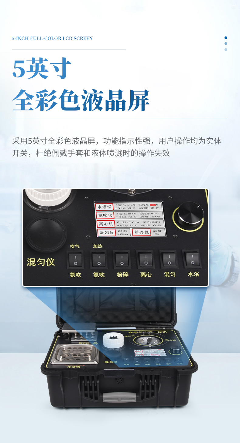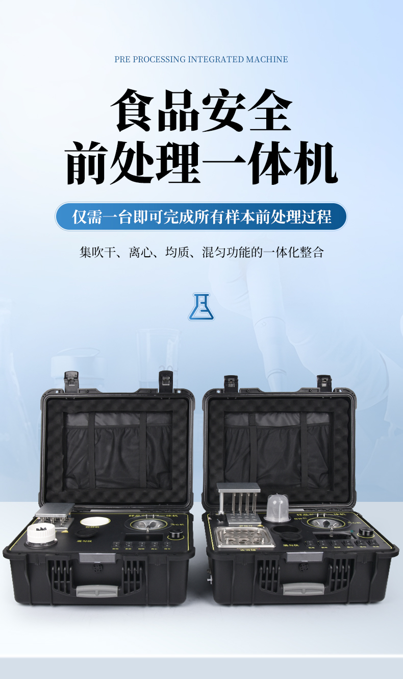 QC4型四合一樣品檢測前處理一體機(箱)是集吹干、離心、均質、混勻功能的一體化整合,極大的簡化和集中樣品前處理的一般操作過程,結合移動便攜的工程塑料箱體,特別適合農獸藥殘留畜禽水產品質量安全現場快速檢測。