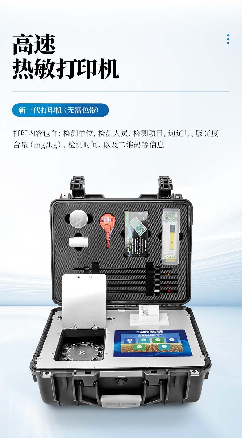 15、內置新一代高速熱敏打印機(無需色帶),打印內容包含:檢測單位、檢測人員、檢測項目、通道號、吸光度、養分含量(mg/kg)、檢測時間、以及二維碼等信息