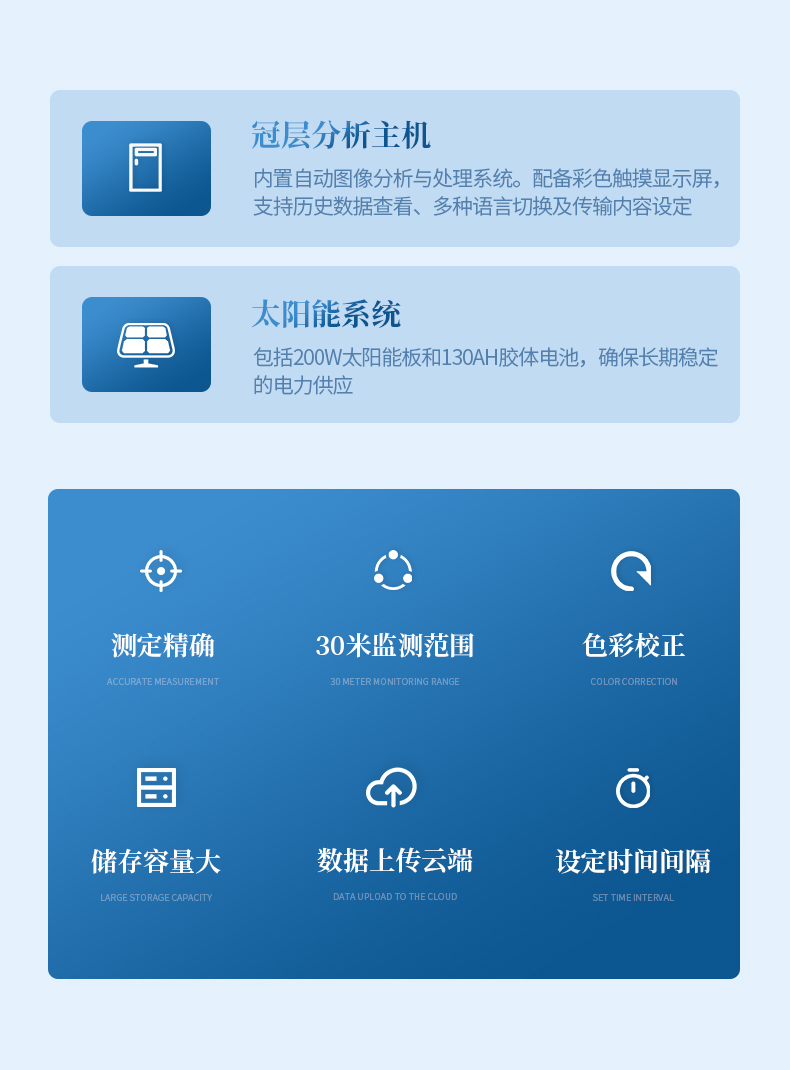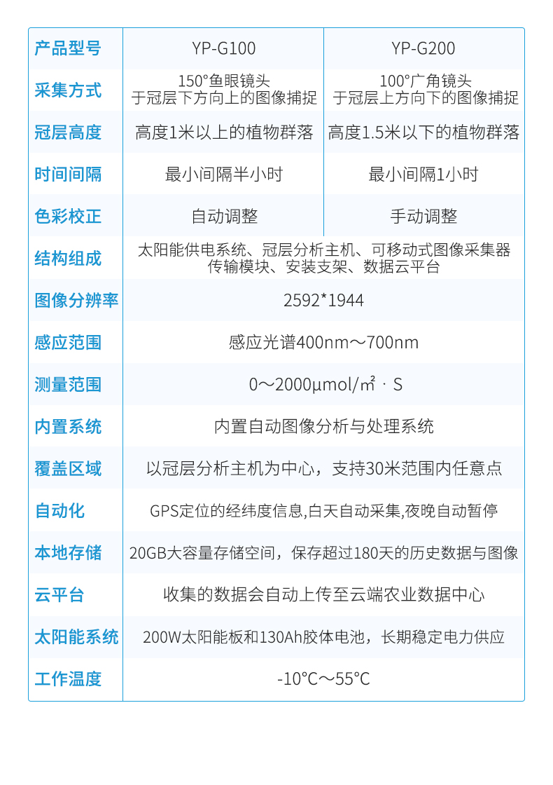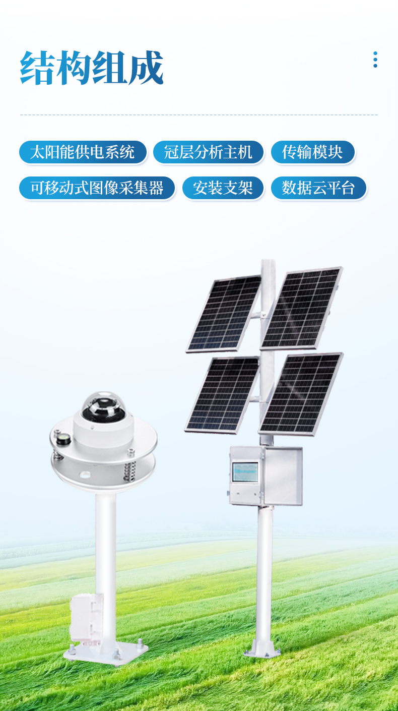 太陽能供電系統、冠層分析主機、可移動式圖像采集器(含100°鏡頭)、傳輸模塊、安裝支架、數據云平臺