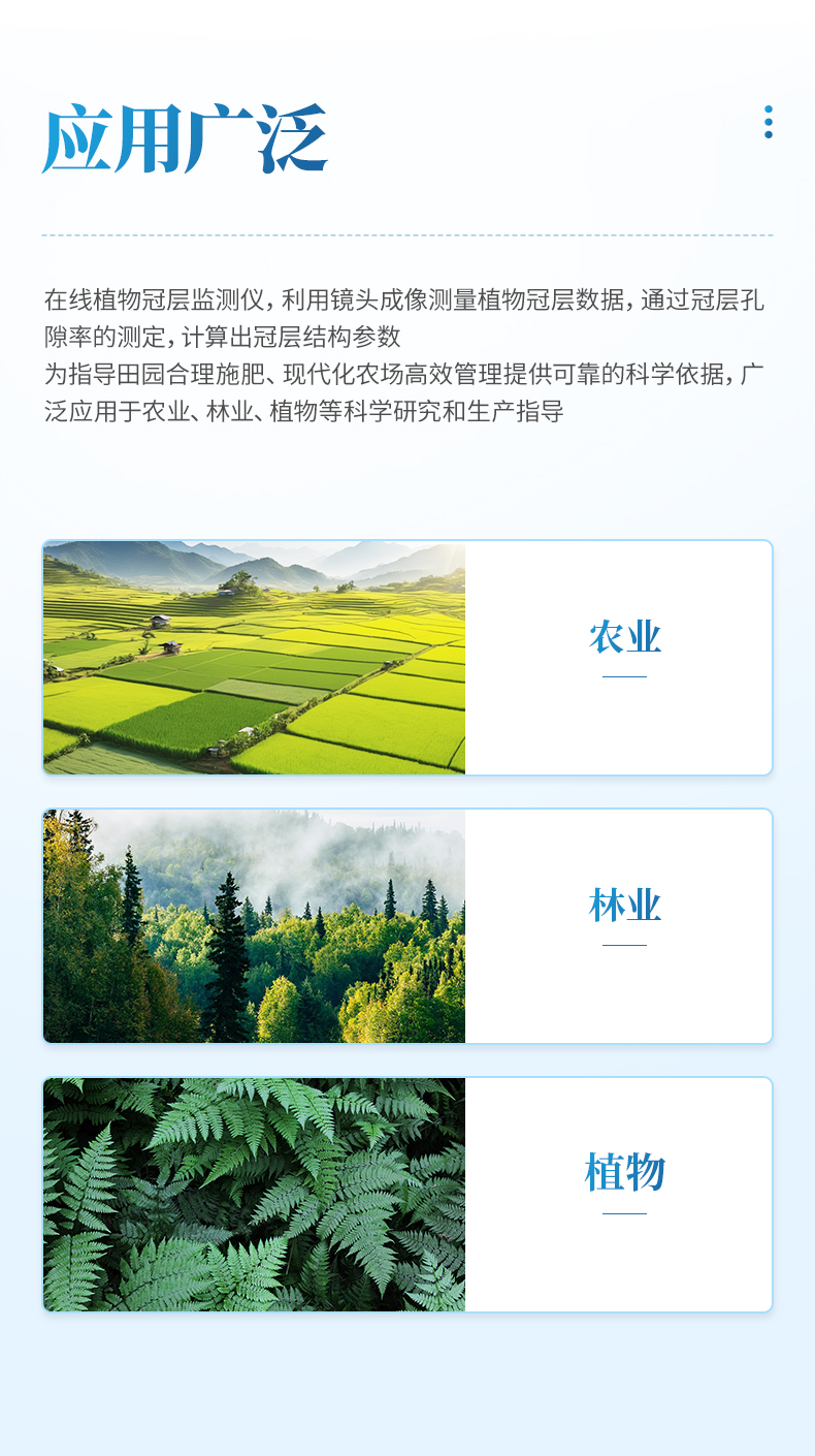 在線植物冠層監測儀是一款用于實時監測植物冠層狀態的設備,利用鏡頭成像測量植物冠層數據,通過冠層孔隙率的測定,計算出冠層結構參數;這是目前世界上各種冠層儀一致采用的原理,該方法是各類方法中精確、省力、省時、快捷方便的方法。為指導田園合理施肥、現代化農場高效管理提供可靠的科學依據,廣泛應用于農業、林業、植物等科學研究和生產指導。