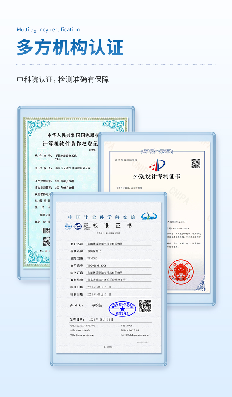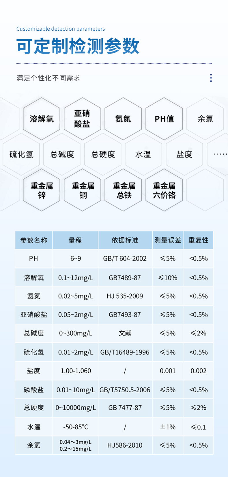 余氯、總氯、有效氯、氨氮、溶解氧、pH、濁度、懸浮物、二氧化氯、臭氧、尿素、色度、氯化物、氰尿酸、硫化氫、亞硝酸鹽、磷酸鹽、總硬度、總堿度、水溫、鹽度等20多種檢測指標任選11種;