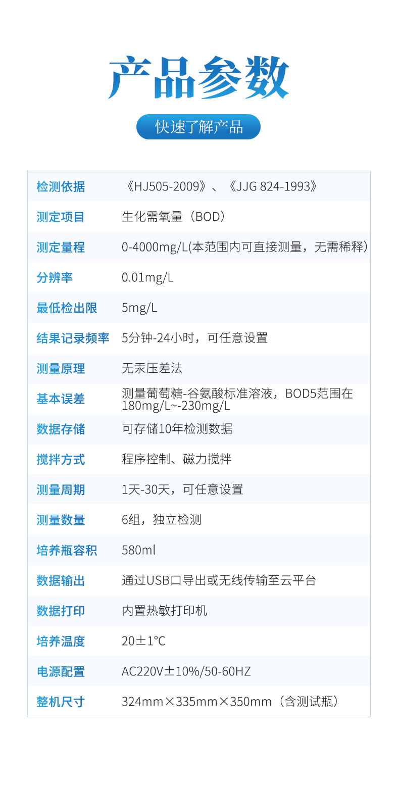 BOD生化需氧量測定儀是根據國家標準《HJ505-2009》5日培養法,模擬自然界中有機物的生物降解過程,采用簡單、安全、可靠的無汞壓差感測法測量水中BOD;全智能化設計,領先的研發工藝和設計制造,實驗過程無需實驗人員值守;適用于排污企業、環境監測、污水處理廠、第三方檢測機構、科研、高校等領域的生化需氧量測定。