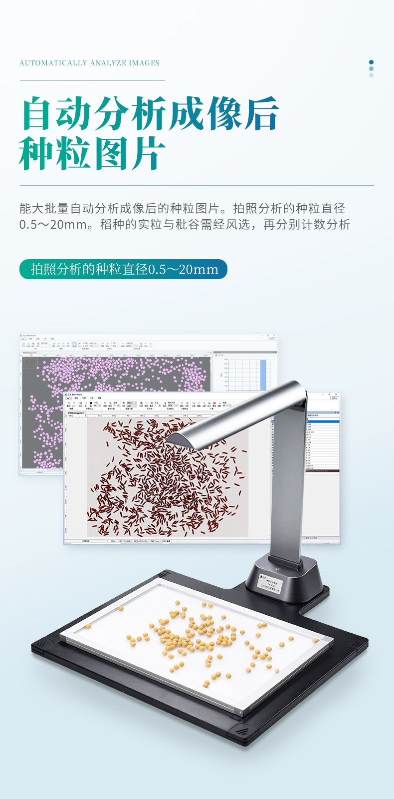 2、成像特性:配自動對焦的1600萬像素分辨率彩色高拍儀,及超薄的背光光源板,具有相機畫面畸變、背光板均勻性的自動矯正特性,有效減小尺寸測量誤差。拍照分析的種粒直徑0.5~20mm。稻種的實粒與秕谷需經風選,再分別計數分析才能得出水稻的結實率。