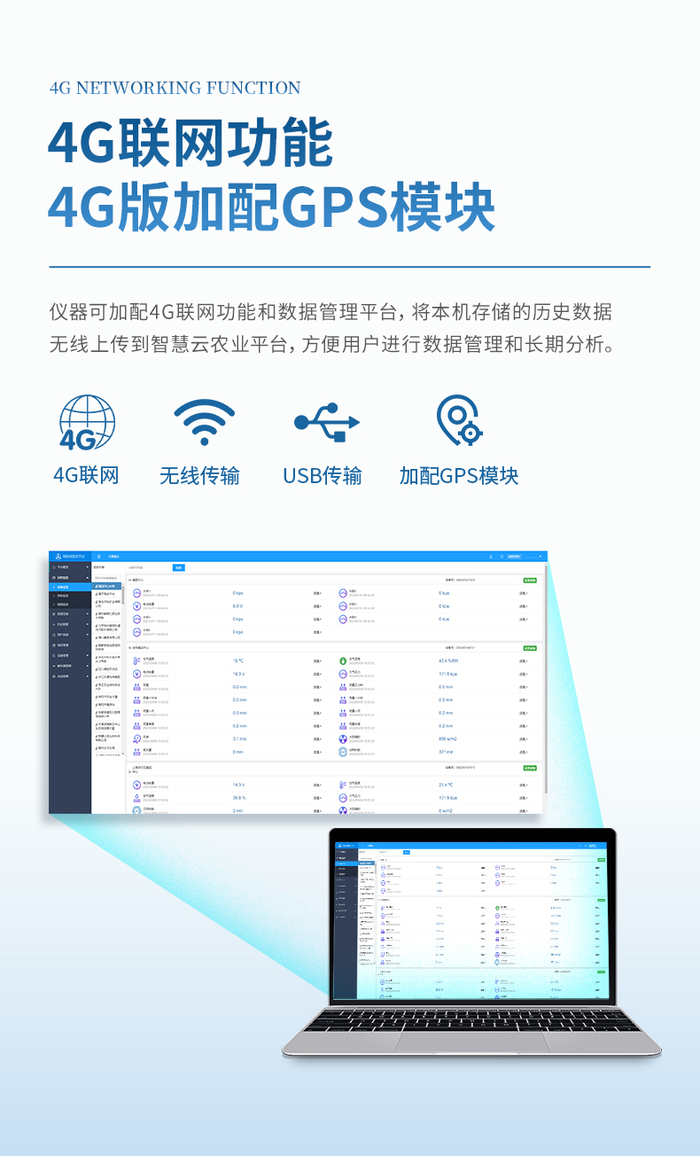 7、儀器配備4G聯網功能數據管理平臺,將本機存儲的被測點環境因子測量歷史數據無線上傳到智慧云農業平臺,方便用戶進行數據管理和長期分析。