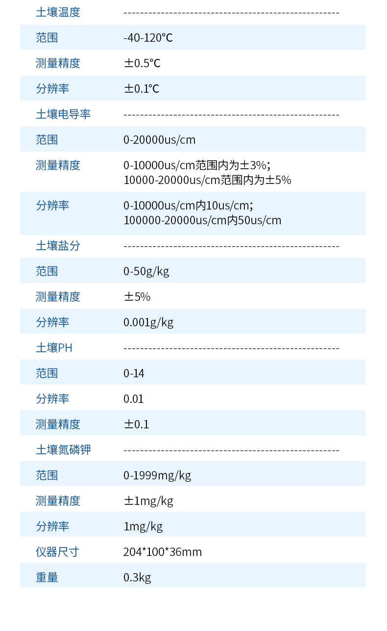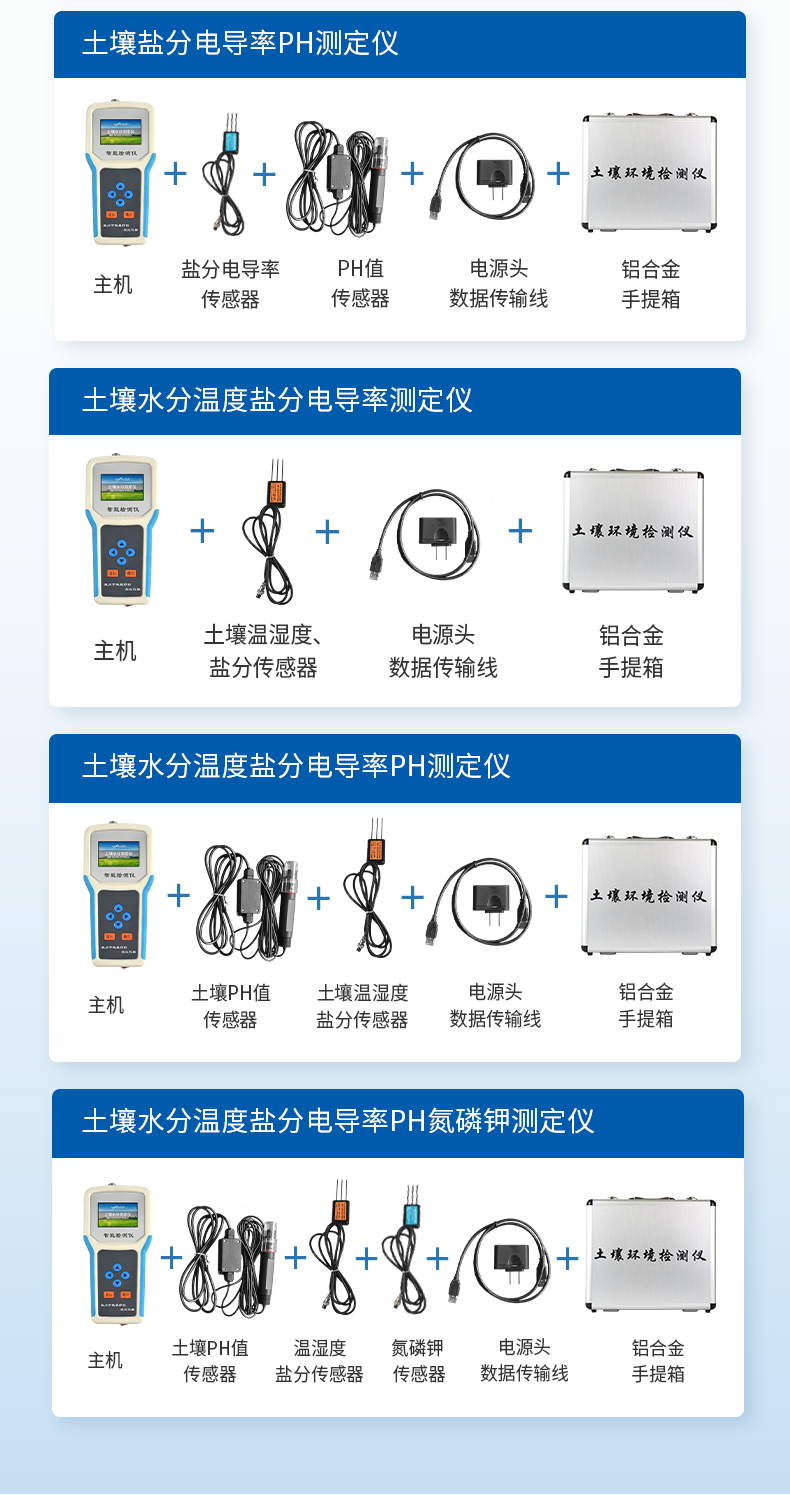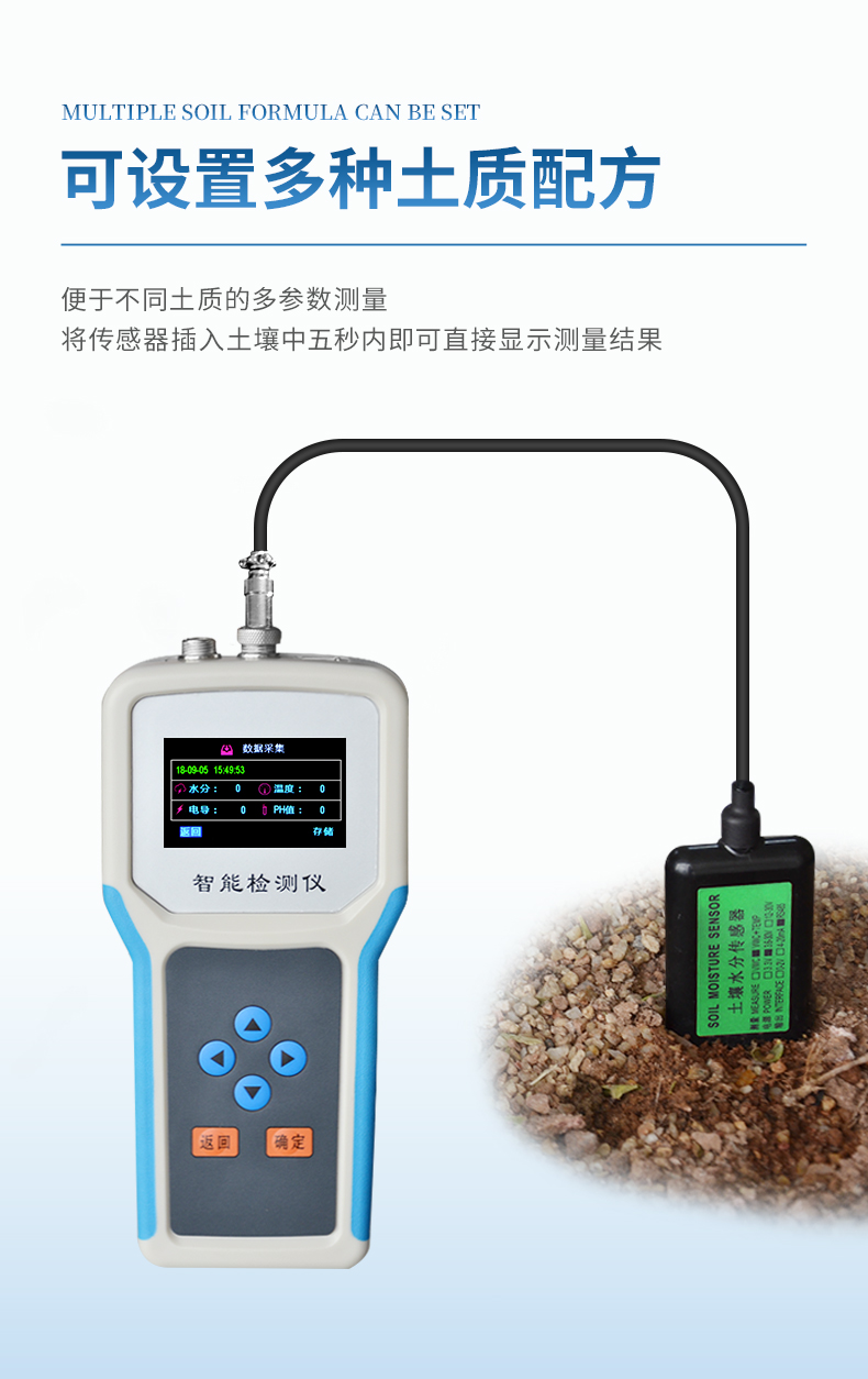 土壤水分溫度鹽分PH測定儀采用一體化結構設計,可快速準確測量土壤中含水量、溫度、電導率(鹽分)、酸堿度,可對多處樣地、不同土壤深度的水分含量溫度鹽分和PH進行快速檢測和長期連續監測。