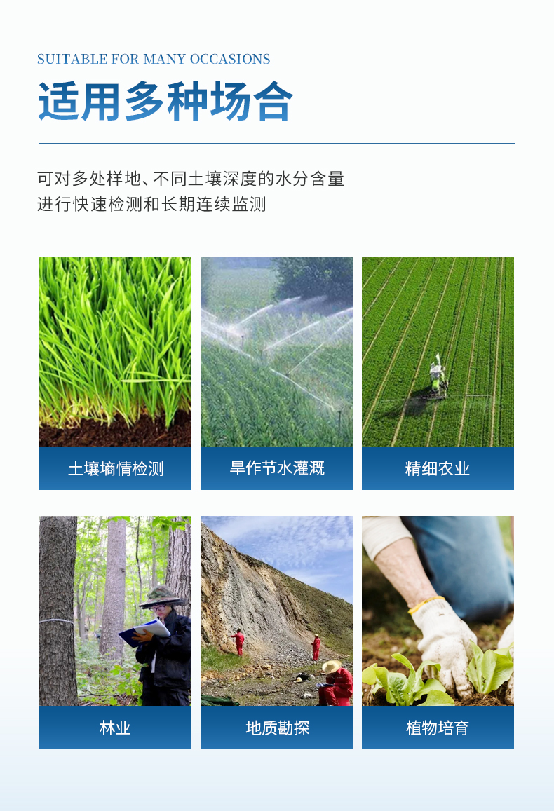 廣泛應用于土壤墑情檢測、旱作節水灌溉、精細農業、林業、地質勘探、植物培育、水利、環保等領域。