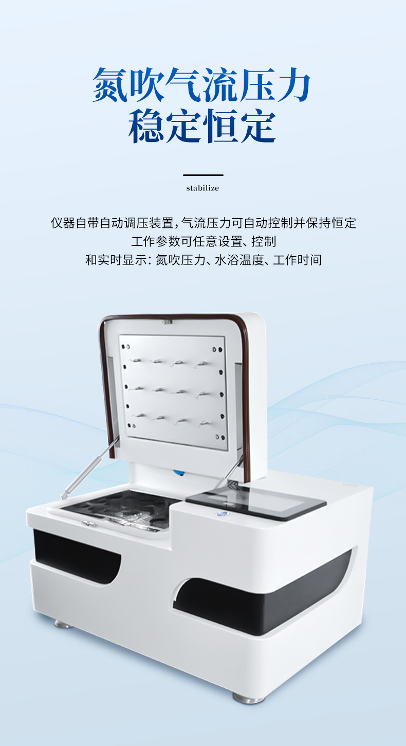 5、工作參數任意設置、控制和實時顯示:主要工作參數,溫度、氮吹時間和氣體壓力;