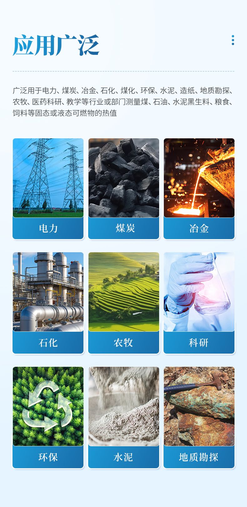 適用于生產、研究和使用可燃物質的企業、大專院校、科研部門及軍工單位用來測定 煤炭、焦炭、化工、糧食、木材、飼料等可燃物質的發熱量和火藥的爆熱值。