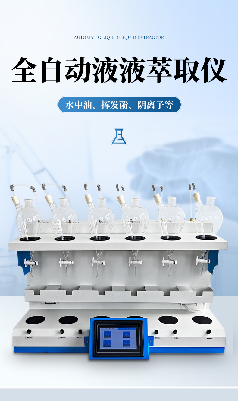 全自動液液萃取儀采用新封閉式靜音潔凈空氣內循環震蕩原理,雙向氣液混合技術,用于實驗室水質檢測水中油、揮發酚、陰離子等項目的液液萃取前處理,設備通過大液晶觸摸屏顯示和設置多項萃取參數以滿足不同樣品的萃取要求,實驗過程無需人工看管,設備實現自動萃取,自動放氣,自動收集,自動排液,自動清洗等功能