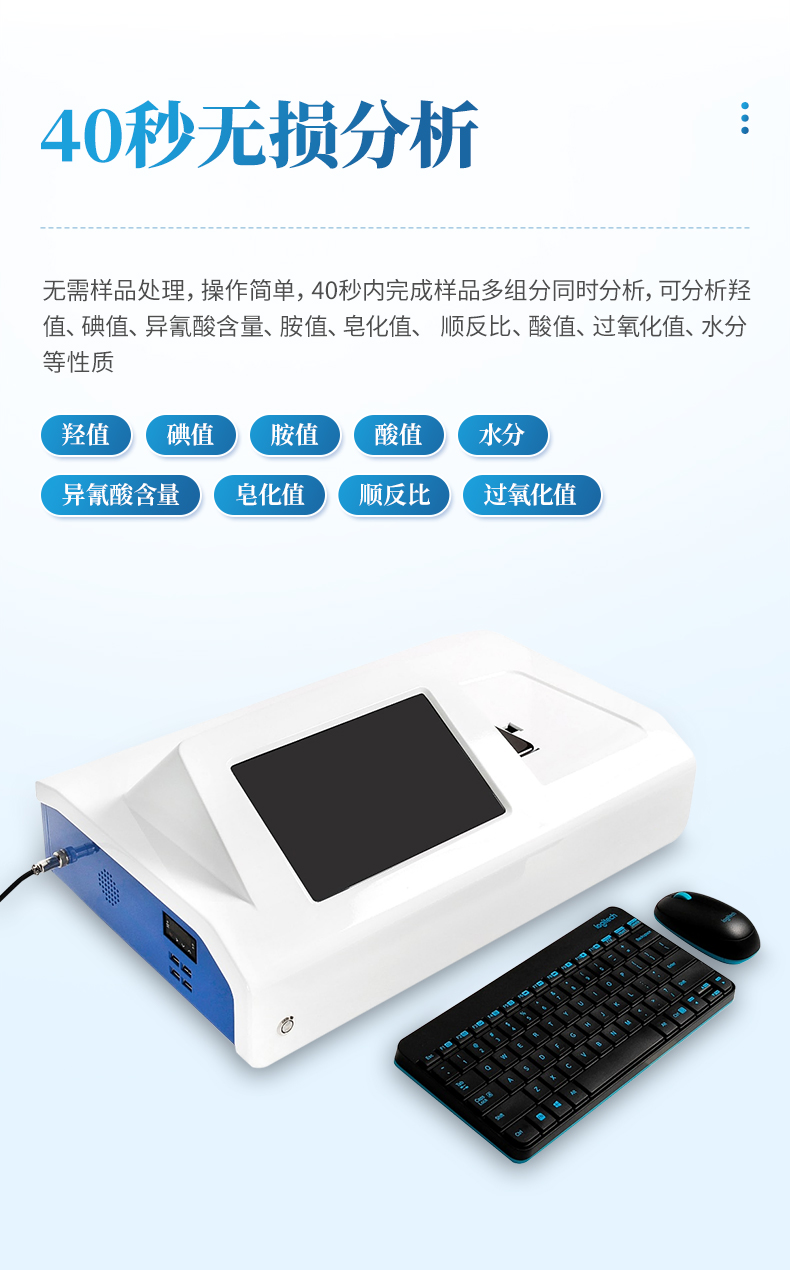 無需樣品處理,操作簡單,快速分析,40秒內完成樣品多組分 同時分析,可分析羥值、碘值、異氰酸含量、胺值、皂化值、 順反比、酸值、過氧化值、水分等性質