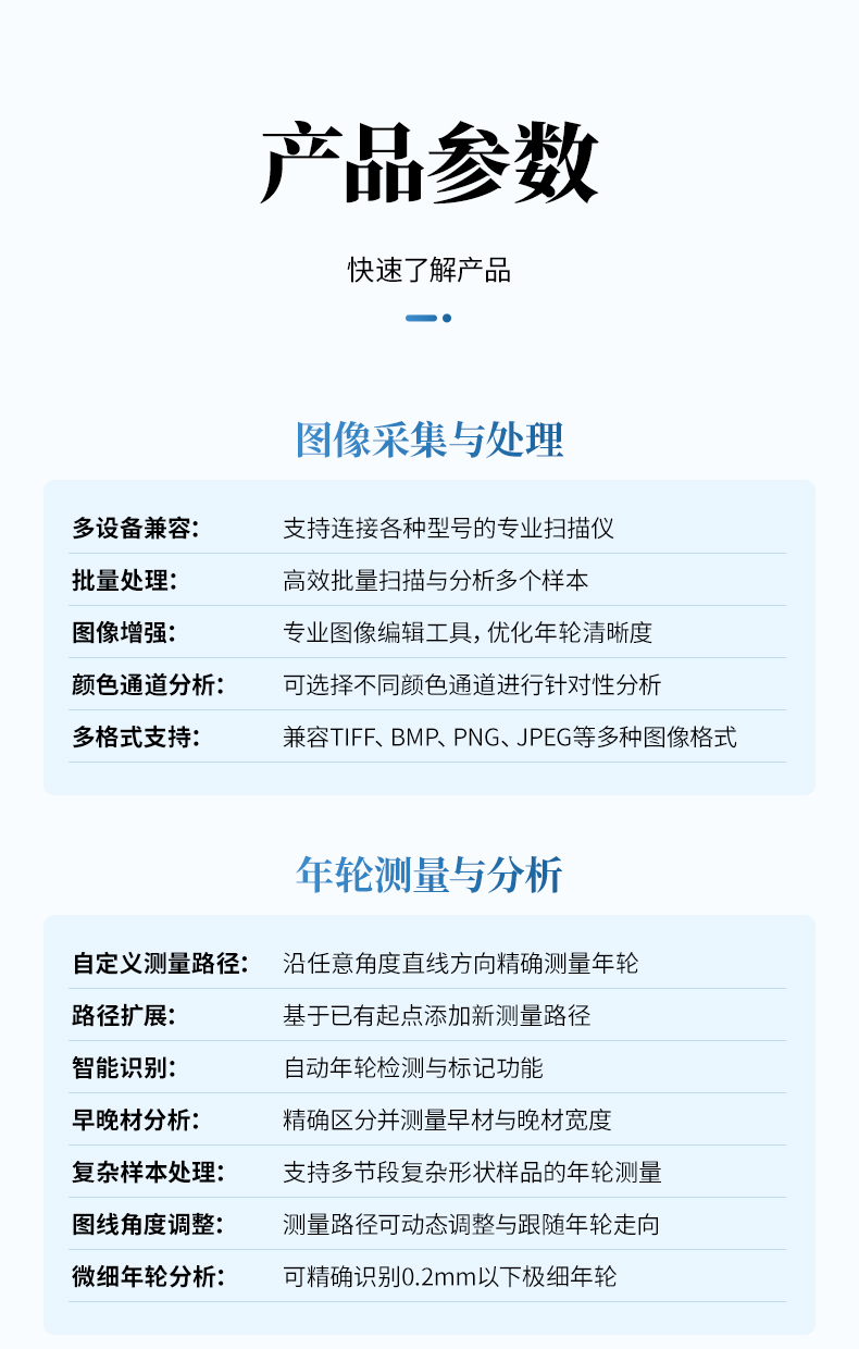 年輪圖像分析系統是一款專業的樹木年輪研究工具,用于對盤狀木材截面或柱狀生長錐樣本進行年輪分析。系統集成了圖像采集、分析處理和數據統計等功能,可為林業研究、生態學研究等領域提供準確的數據支持。