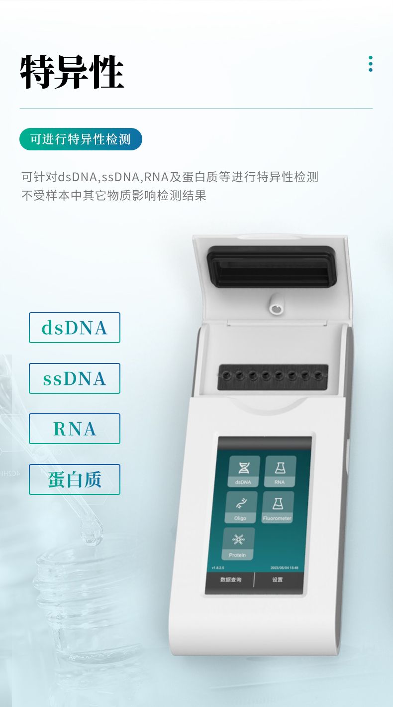 特異性---可針對dsDNA,ssDNA,RNA及蛋白質(zhì)等進行特異性檢測,不受樣本中其它物質(zhì)影響檢測結(jié)果